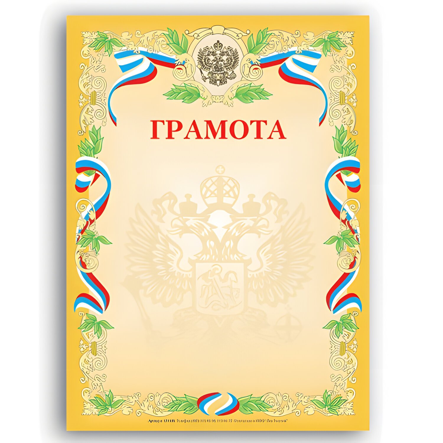 Изготовлена из импортного мелованного картона плотностью 200 г/м2. Символика выполнена с помощью бронзовой краски, что подчеркивает статус и торжественность грамоты. Составляется в свободной форме. Имеется изображение российской символики. Формат А4.