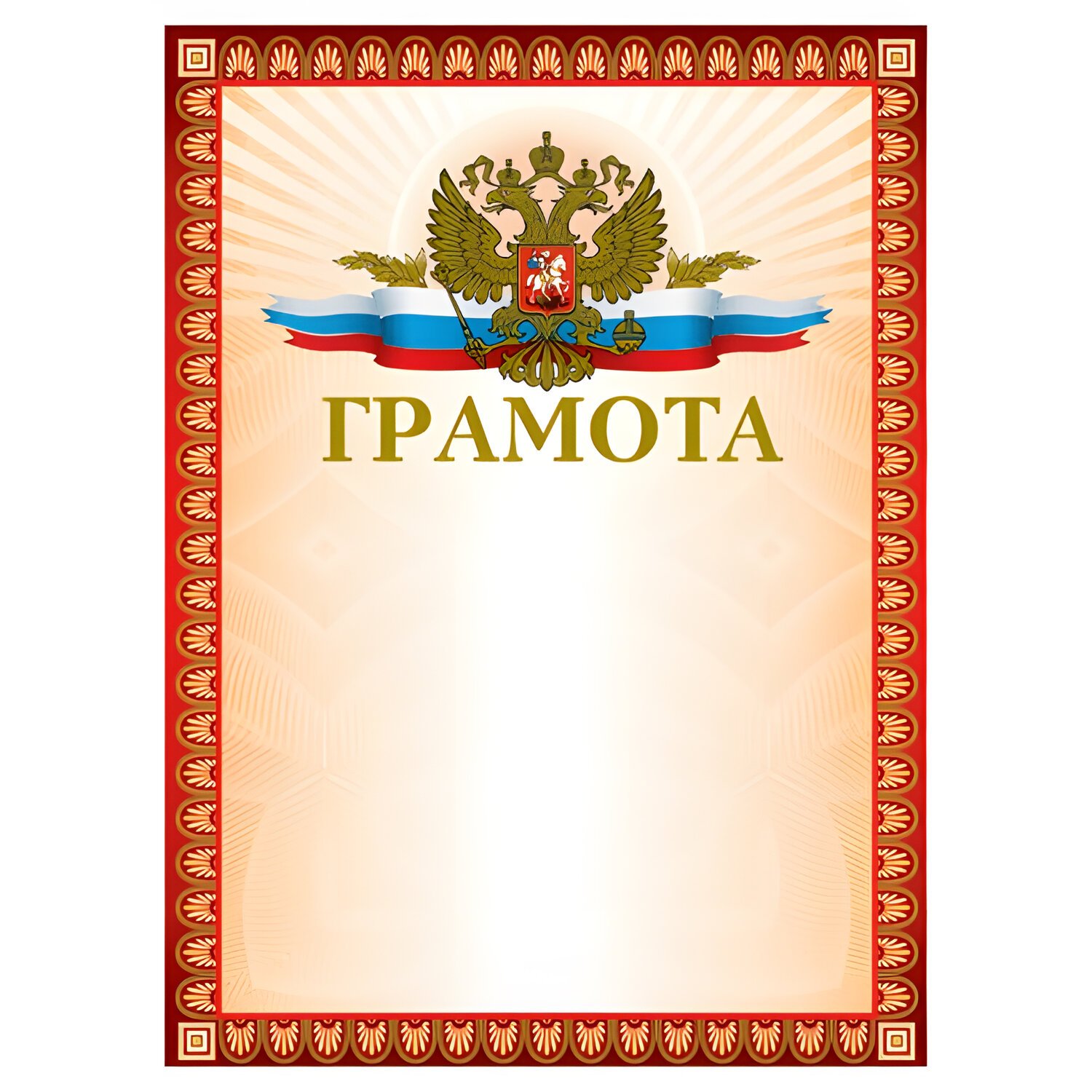 Изготовлена из импортного мелованного картона плотностью 230 г/м2. Надписи выполнены с помощью конгревного тиснения фольгой, что подчеркивает статус и торжественность грамоты. Составляется в свободной форме. Имеется изображение российской символики. Формат А4.