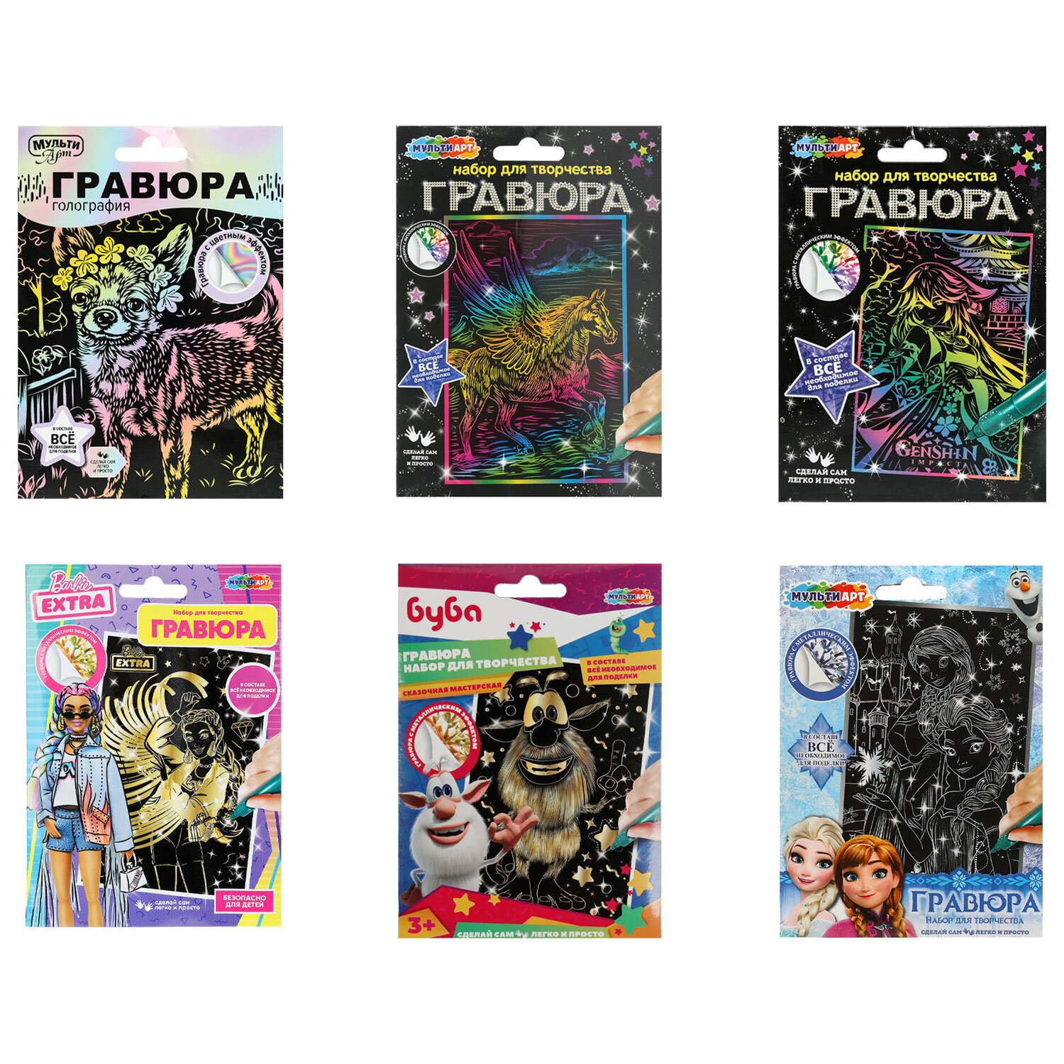 Наборы детских гравюр МУЛЬТИ АРТ могут стать оригинальным подарком для детей. Сцарапывая верхний слой гравюры специальным штихелем, входящим в набор, ребенок может самостоятельно создать настоящее произведение искусства и почувствовать себя художником.