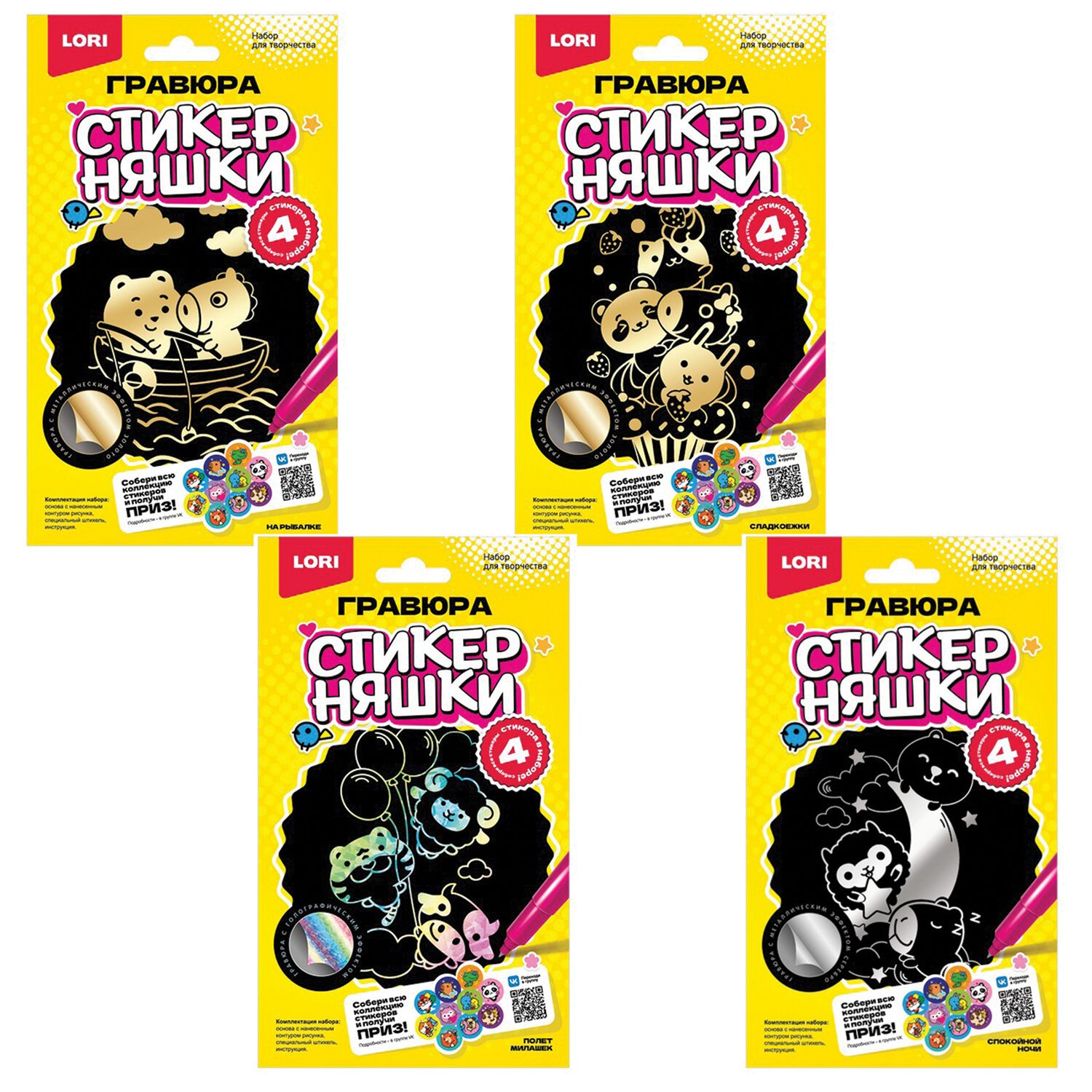 Уникальная коллекция гравюр "Стикерняшки" с милыми персонажами. В состав набора входят: основа с нанесенным контуром рисунка, специальный штихель, инструкция.