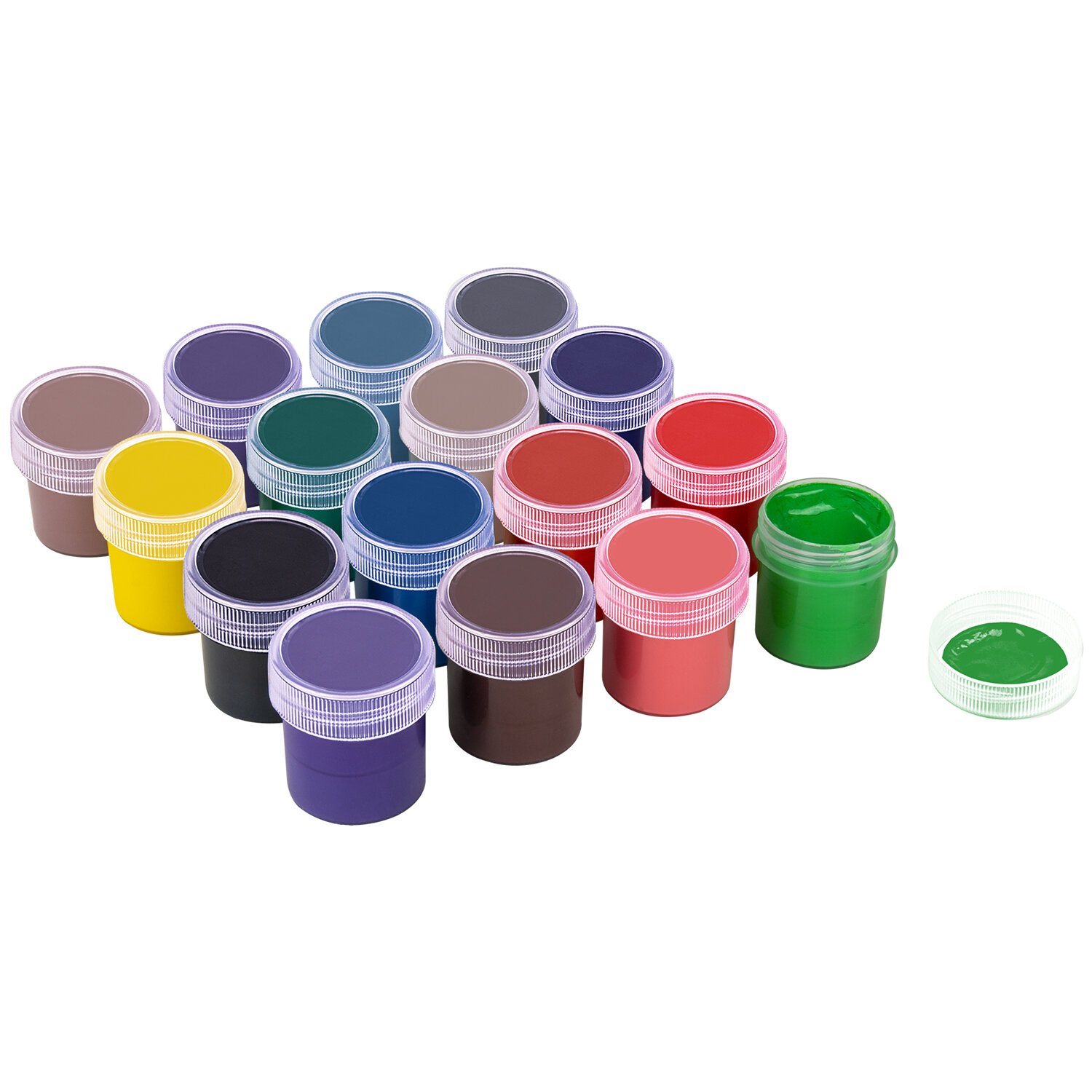 В наборе 16 ярких и насыщенных цветов: белый, красный, черный, синий, желтый, зеленый, коричневый, оранжевый, фиолетовый, светло-зеленый, голубой, розовый, красно-коричневый, охра, кармин, темно-зеленый.