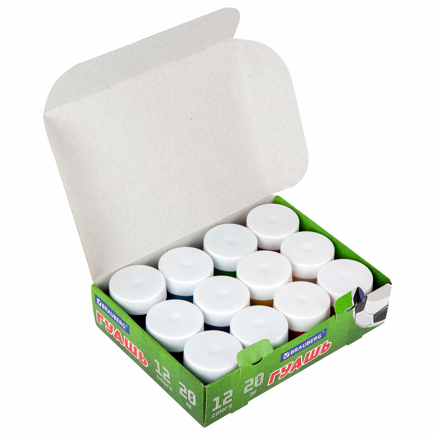 Краски полностью безопасны в использовании, не токсичны, без резкого запаха. Гуашь обладает высокой светостойкостью и укрывистостью, легко смешивается и размывается водой, хорошо наносится, без труда удаляется с рук и одежды. Краски разлиты в пластмассовые герметичные баночки объемом 20 мл. Общий объем – 240 мл.