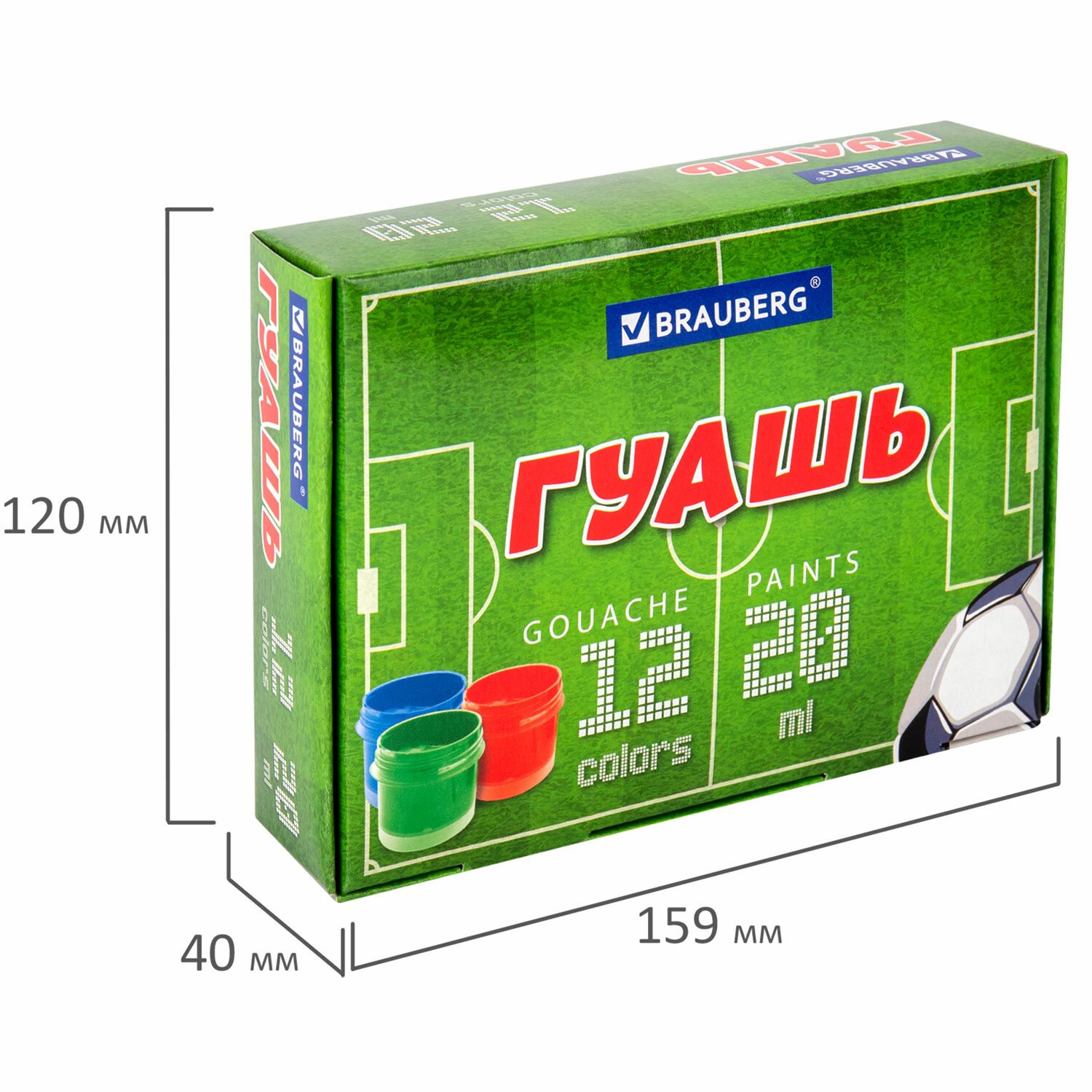 Гуашь BRAUBERG "Футбол", 12 цветов по 20 мл, 192566