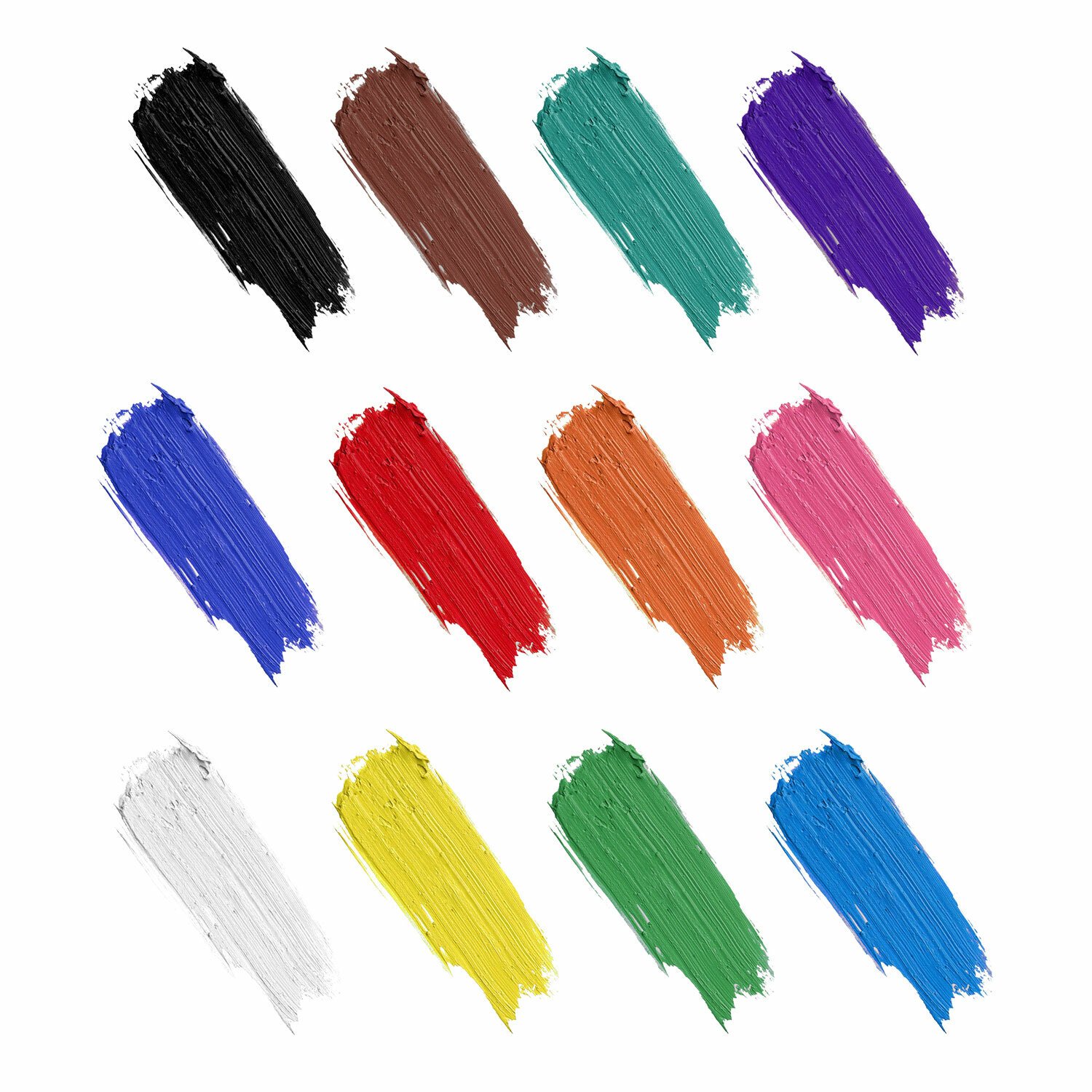 В наборе 12 ярких и насыщенных цветов: белый, красный, черный, синий, желтый, зеленый, коричневый, оранжевый, фиолетовый, светло-зеленый, голубой, розовый.
