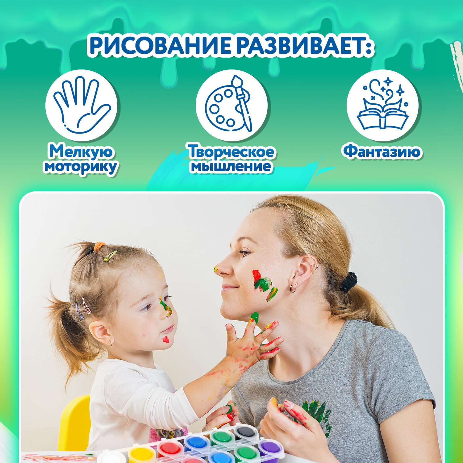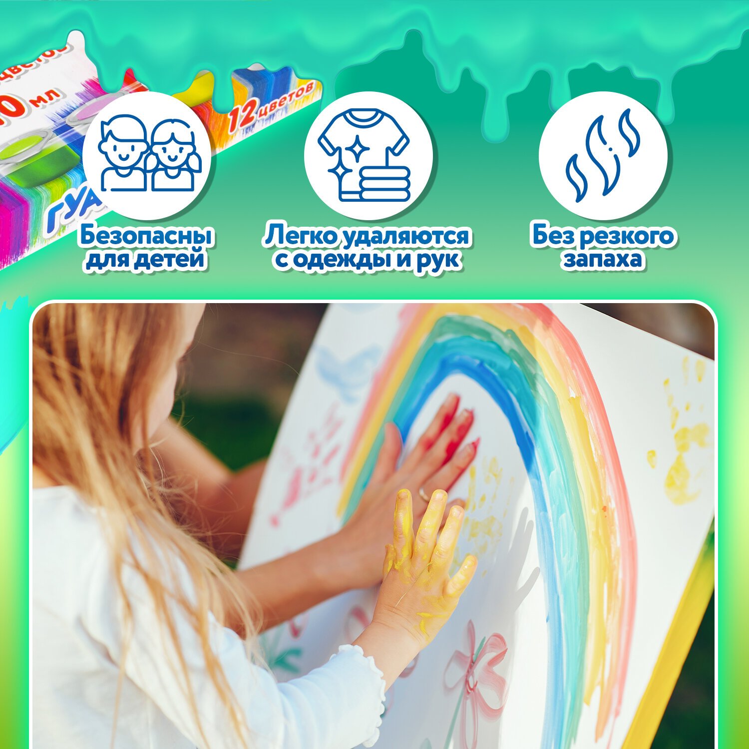 Краски полностью безопасны в использовании, не токсичны и не имеют резкого запаха. Гуашь обладает высокой светостойкостью и укрывистостью, легко размывается водой, хорошо наносится, без труда удаляется с рук и одежды. Краски находятся в пластмассовых герметичных баночках, которые скреплены в блок-тару. Объем каждой баночки равен 10 мл. Общий объем блок-тары – 120 мл.