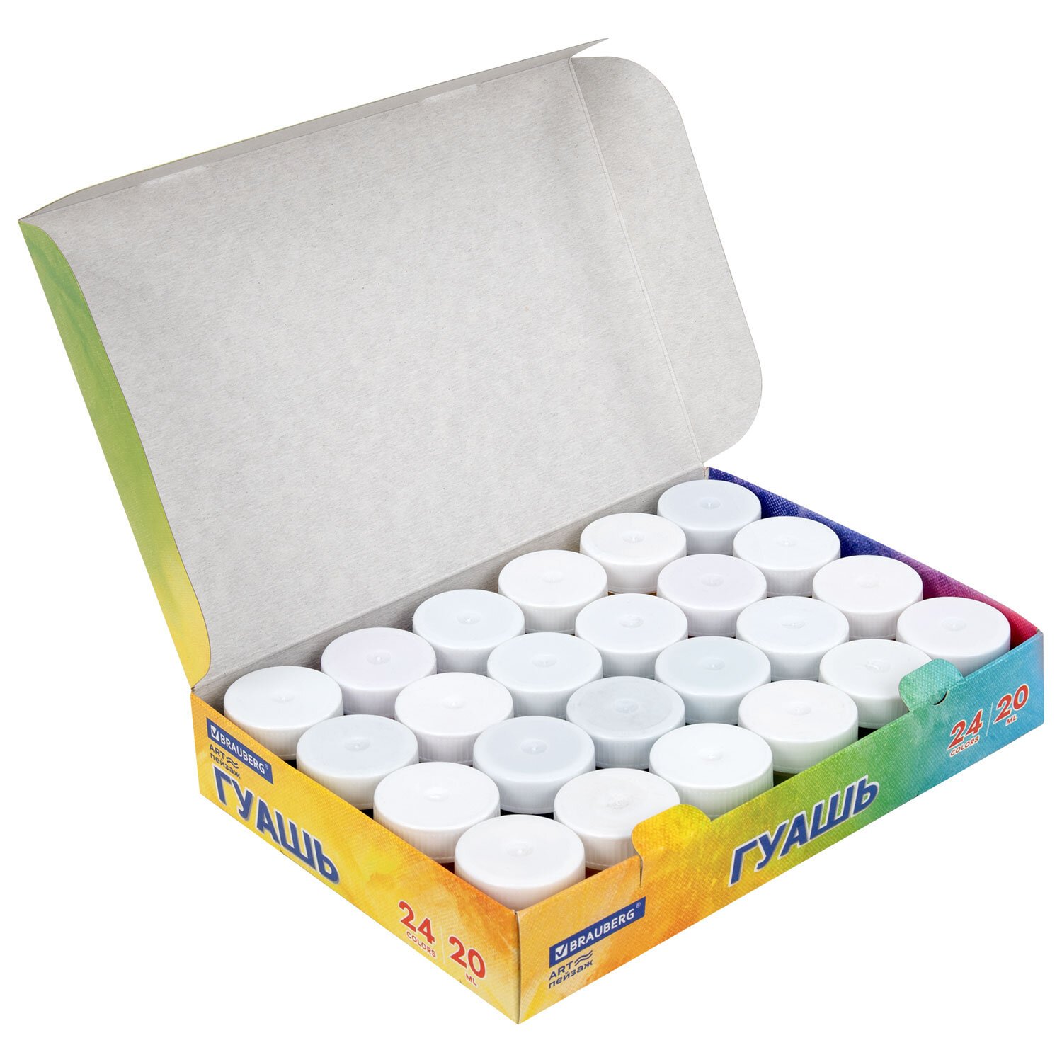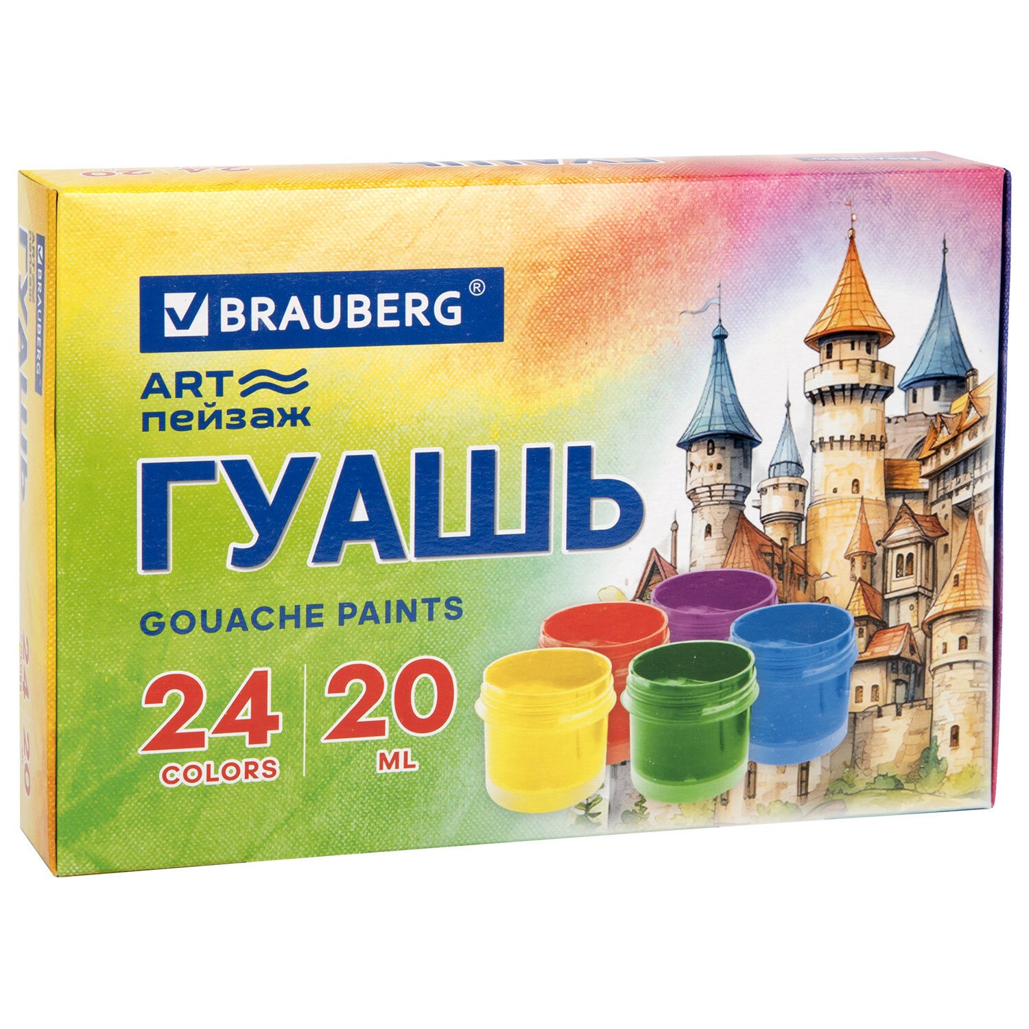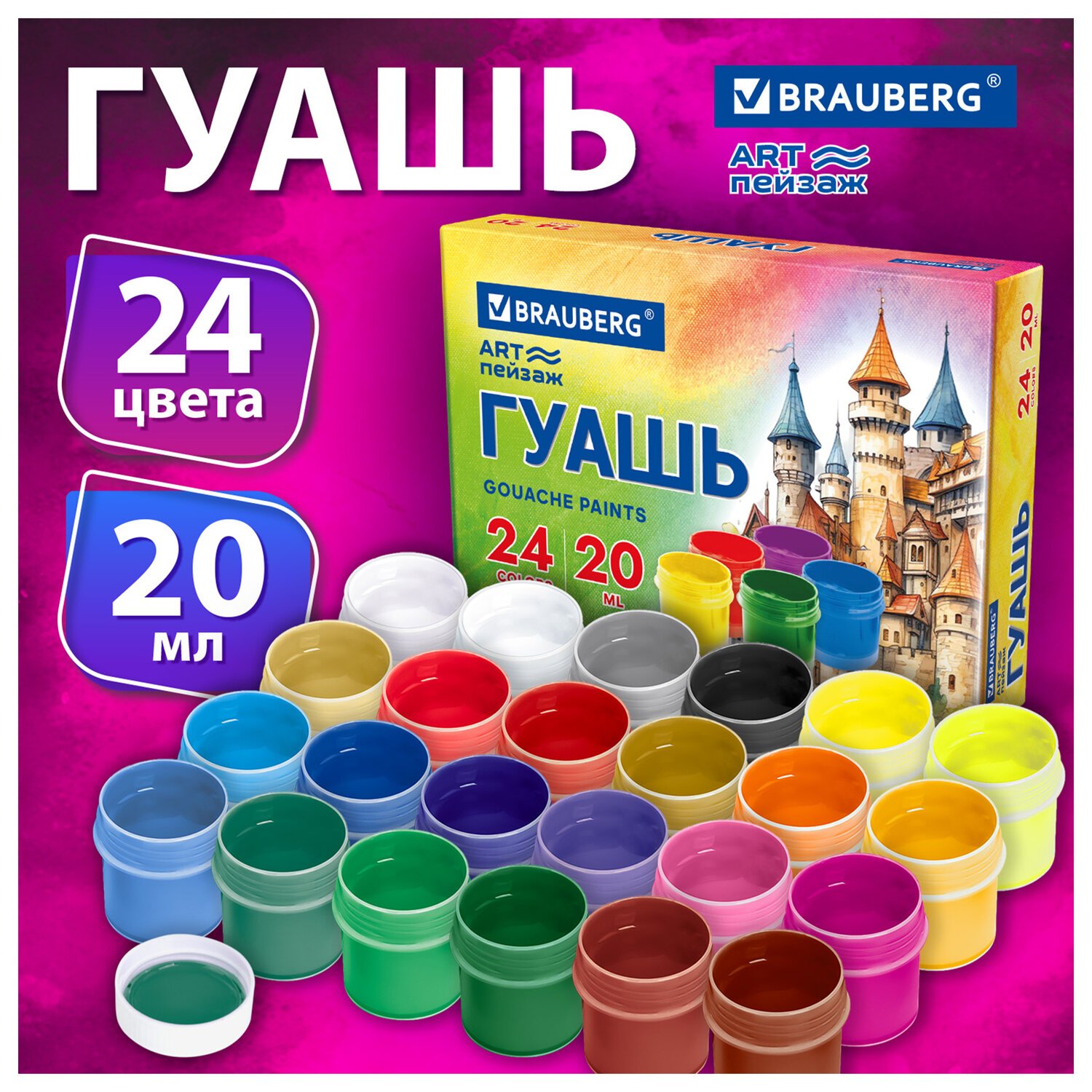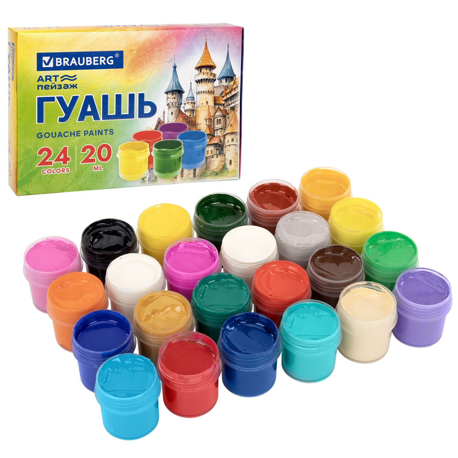 Гуашь BRAUBERG "ЗАМОК" 24 цвета по 20 мл, надежная упаковка, 192689