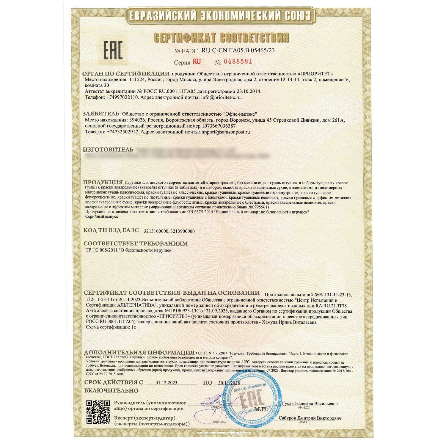 | Упаковка | индивидуальный пакет |