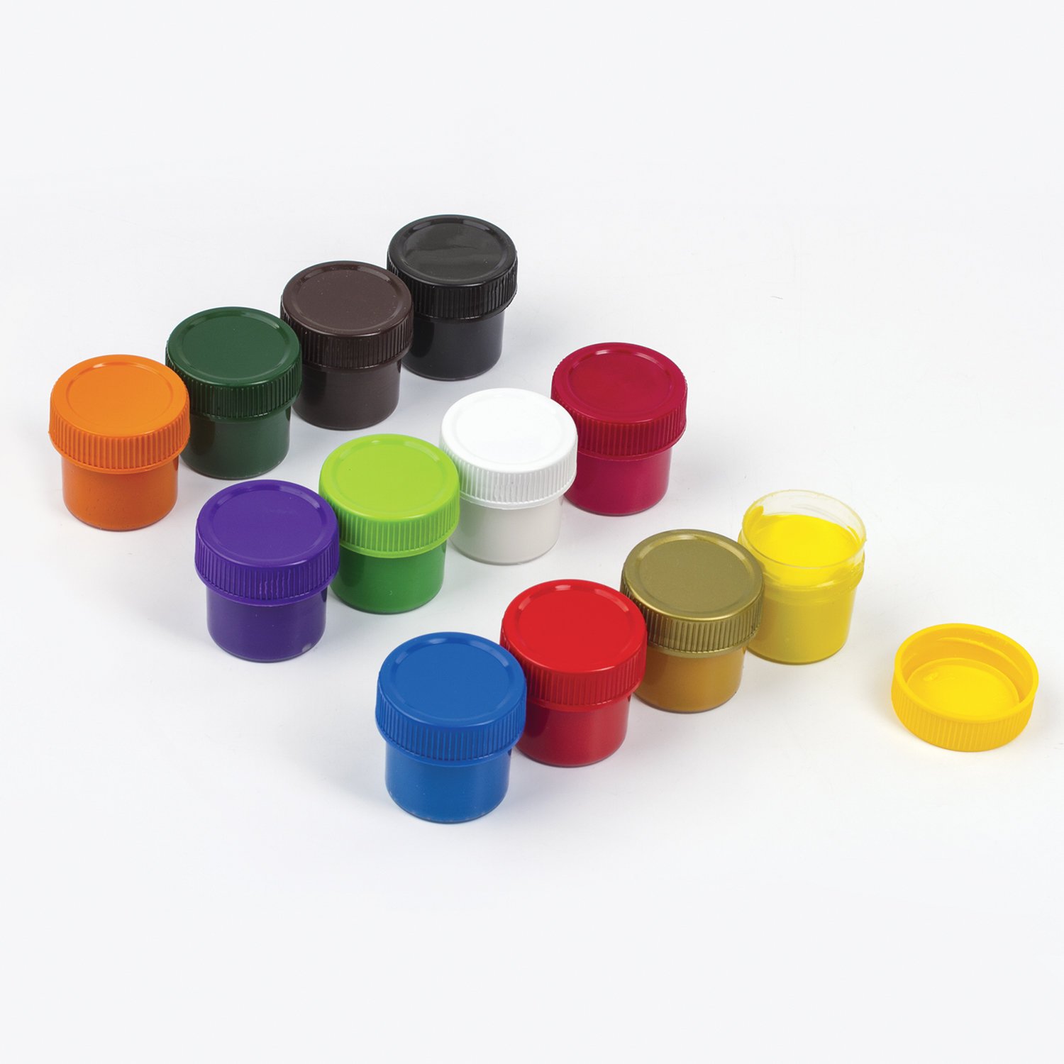 В наборе 12 ярких цветов: белый, черный, красный, желтый, синий, зеленый, оранжевый, кармин, фиолетовый, охра, светло-зеленый, коричневый.
