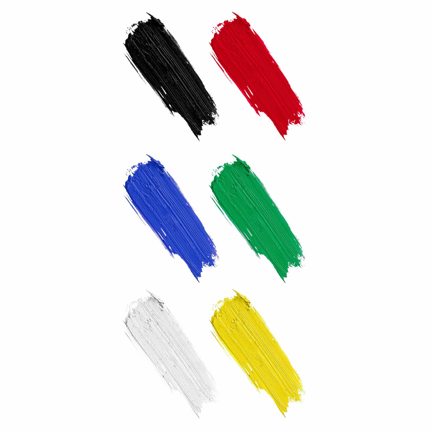 В наборе 6 ярких цветов: белый, черный, красный, желтый, синий, зеленый.