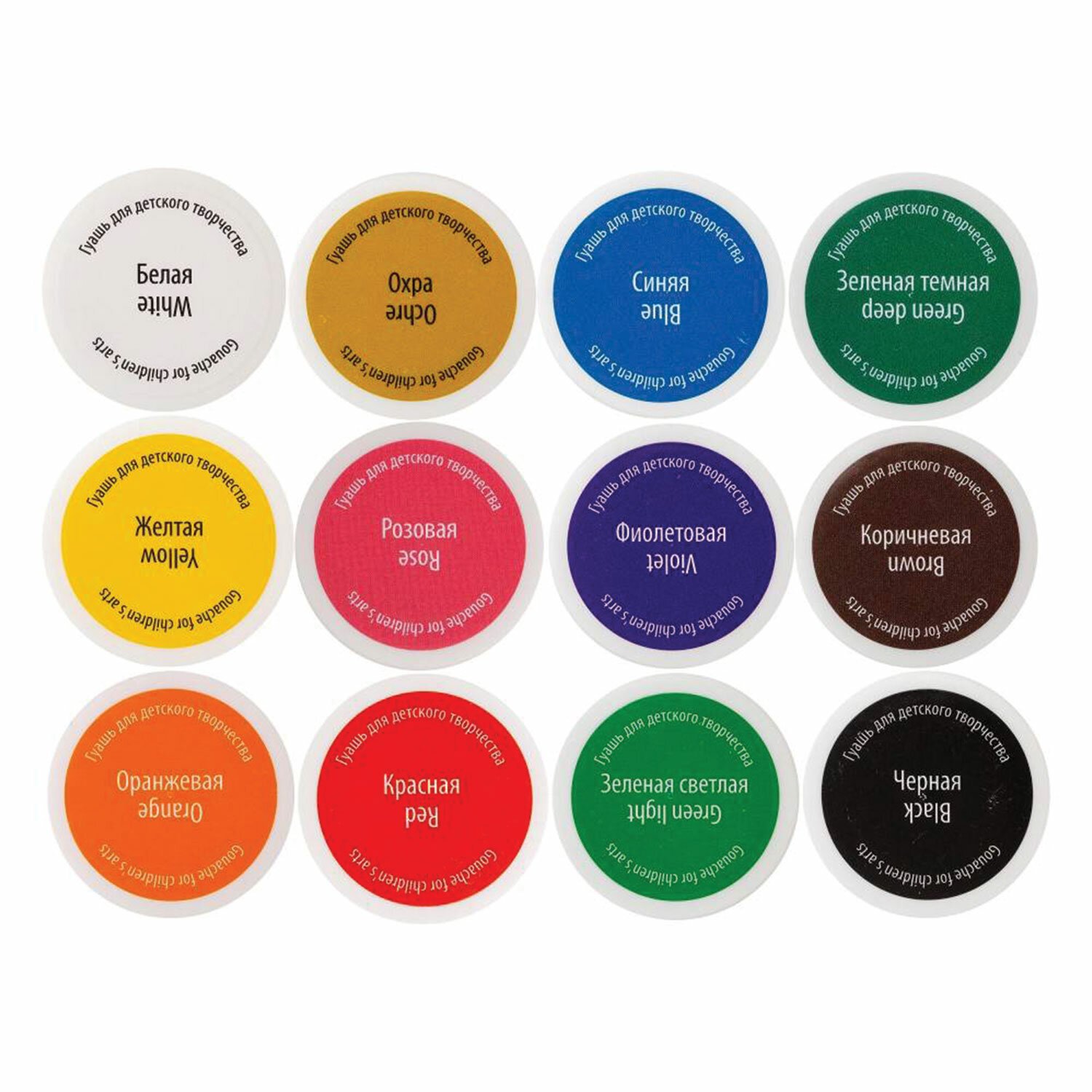 Состав набора: белая, желтая, охра, оранжевая, красная или алая, розовая, синяя, фиолетовая, зеленая светлая, зеленая темная, коричневая, черная.