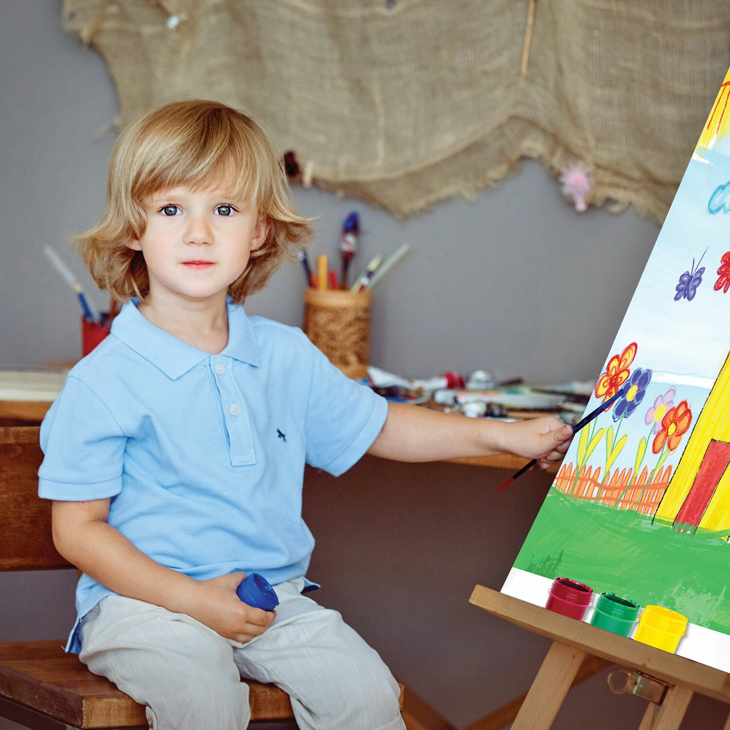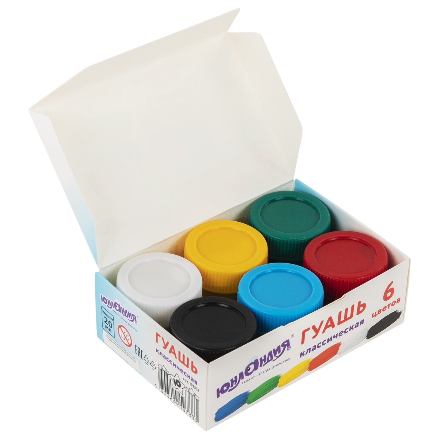 В наборе 6 ярких сочных цветов. Краски полностью безопасны в использовании, не токсичны и не имеют резкого запаха. Гуашь имеет высокую светостойкость и укрывистость, легко размывается водой, хорошо наносится, без труда удаляется с рук и одежды. Краски находится в пластмассовой герметичной баночке объёмом 20 мл. Ребенок сможет легко открыть баночки с винтовыми крышками без помощи взрослых.