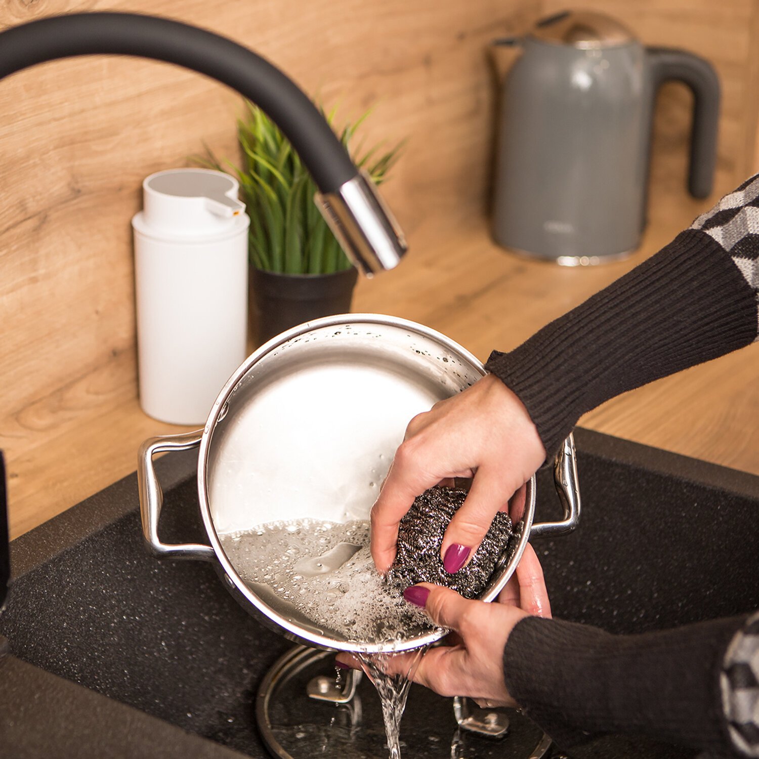 - тщательно удаляет жирную или засохшую грязь, не царапая поверхность и не ранит руки.