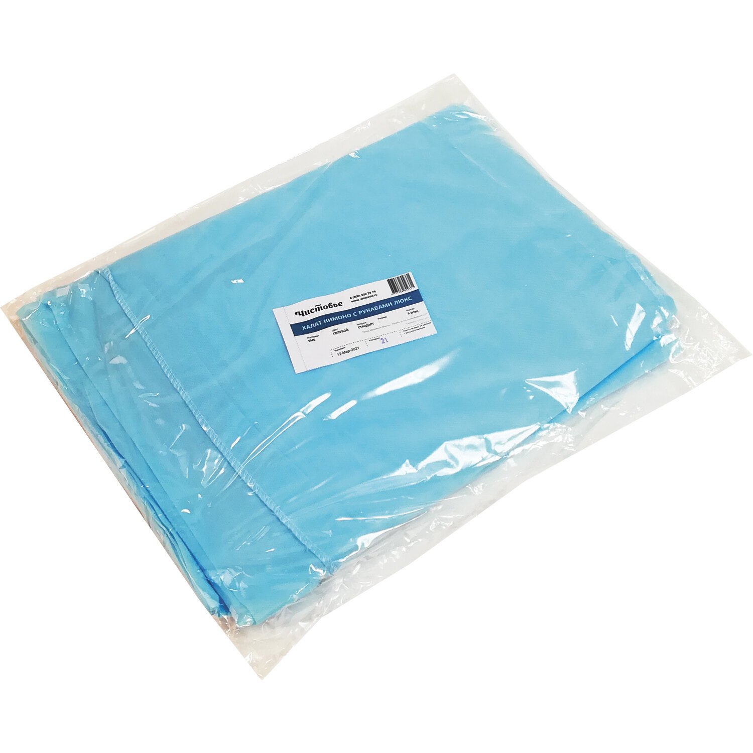Халаты-кимоно с рукавами ЧИСТОВЬЕ изготовлены из голубого нетканого материала СМС плотностью 20 г/м2 и упакованы по 5 штук.