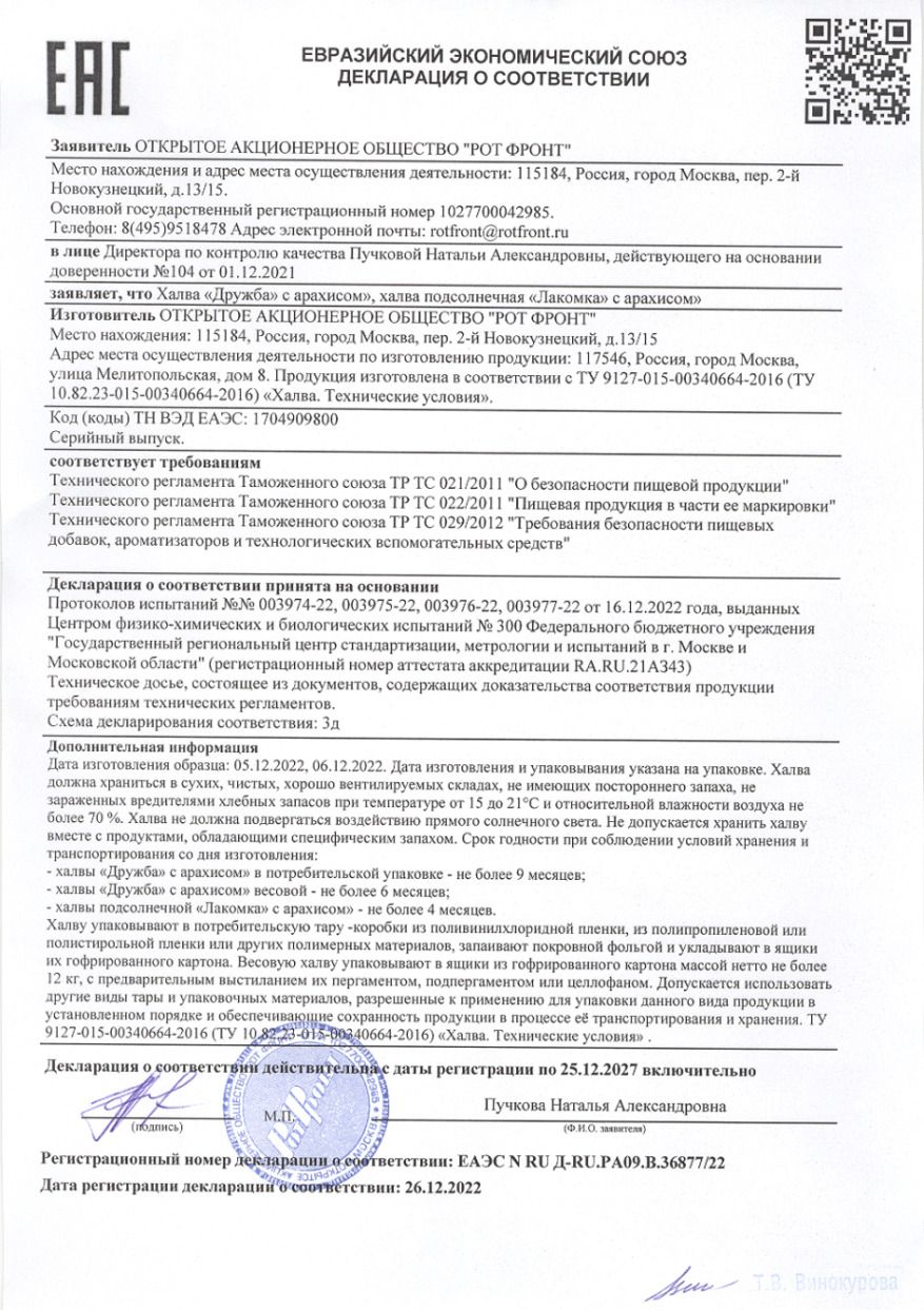 Халва РОТ ФРОНТ "Дружба" с арахисом, 220 г, РФ23672