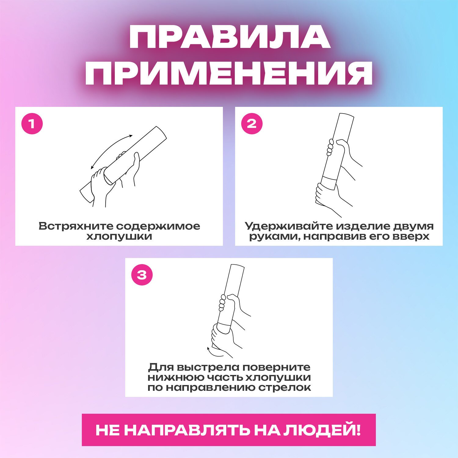 Хлопушка высотой 30 см с бумажным наполнителем в виде прямоугольников розового цвета является абсолютно безопасной. Выстрел осуществляется под действием сжатого воздуха. Не является пиротехникой. Средняя дальность выстрела – 3-5 м. Корпус хлопушки состоит из двух частей: пневматического баллона со сжатым воздухом и картонного цилиндра с наполнителем. Рекомендуется использовать хлопушку внутри больших помещений или на улице.