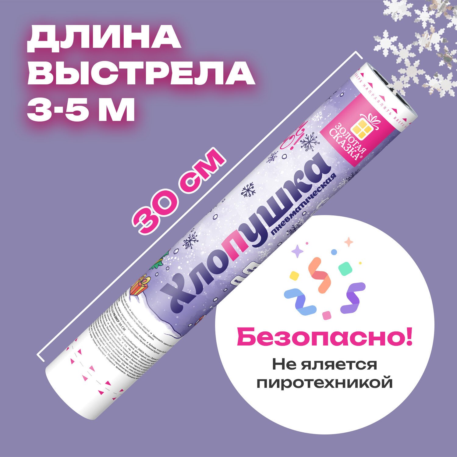 Хлопушка высотой 30 см с фольгированным наполнителем в виде снежинок серебристого цвета является абсолютно безопасной. Выстрел осуществляется под действием сжатого воздуха. Не является пиротехникой. Средняя дальность выстрела – 3-5 м. Корпус хлопушки состоит из двух частей: пневматического баллона со сжатым воздухом и картонного цилиндра с наполнителем. Рекомендуется использовать хлопушку внутри больших помещений или на улице.