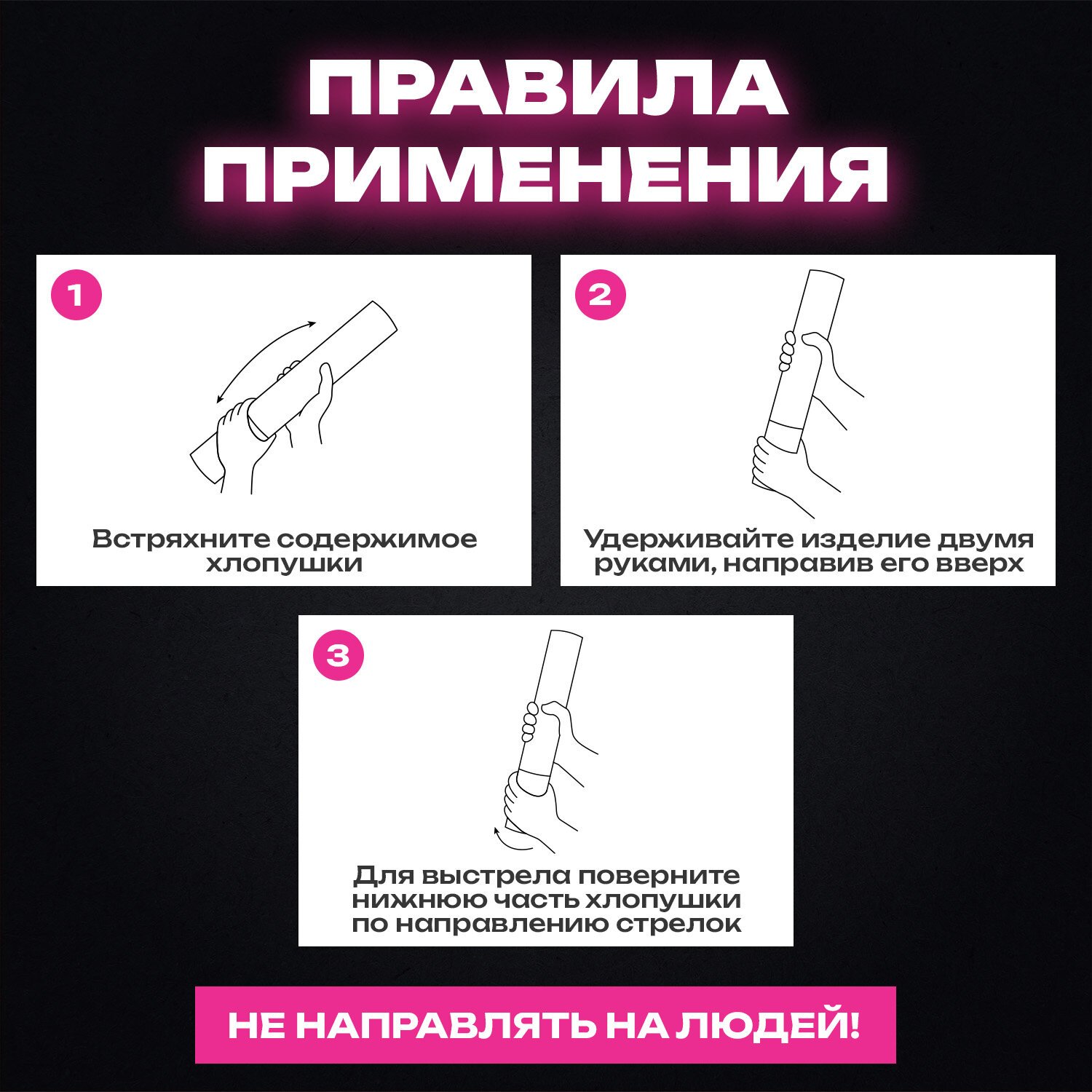 Пневматическая хлопушка не является пиротехникой и работает на основе энергии сжатого воздуха. Конфетти и серпантин ярких цветов можно использовать в помещении или на улице. Хлопушка подойдет для праздников, концертов, реквизита для фотосессии.