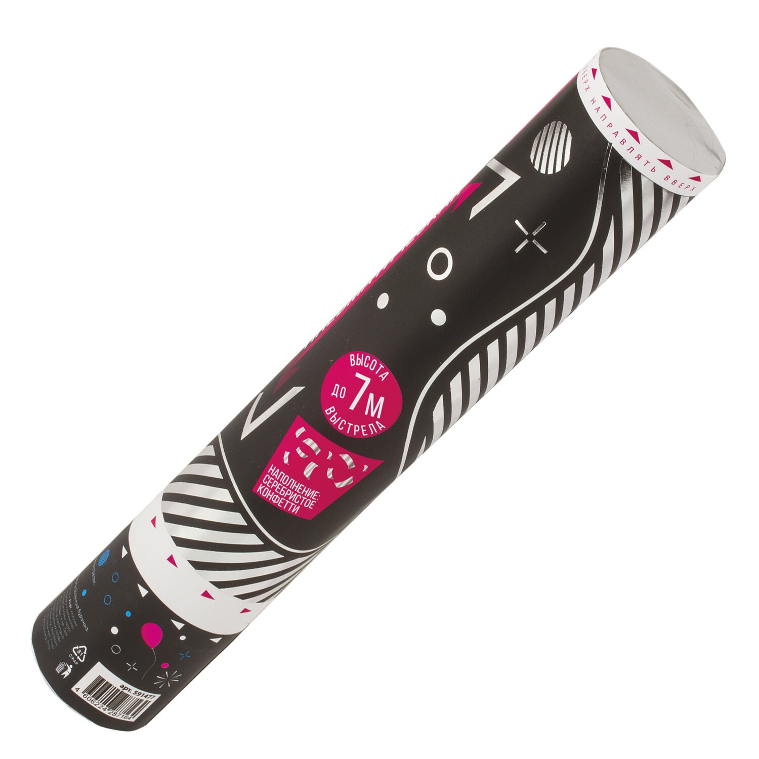 Хлопушка высотой 30 см с фольгированным наполнителем в виде прямоугольников серебристого цвета является абсолютно безопасной. Выстрел осуществляется под действием сжатого воздуха. Не является пиротехникой. Средняя дальность выстрела – 5-7 м. Корпус хлопушки состоит из двух частей: пневматического баллона со сжатым воздухом и картонного цилиндра с наполнителем. Рекомендуется использовать хлопушку внутри больших помещений или на улице.