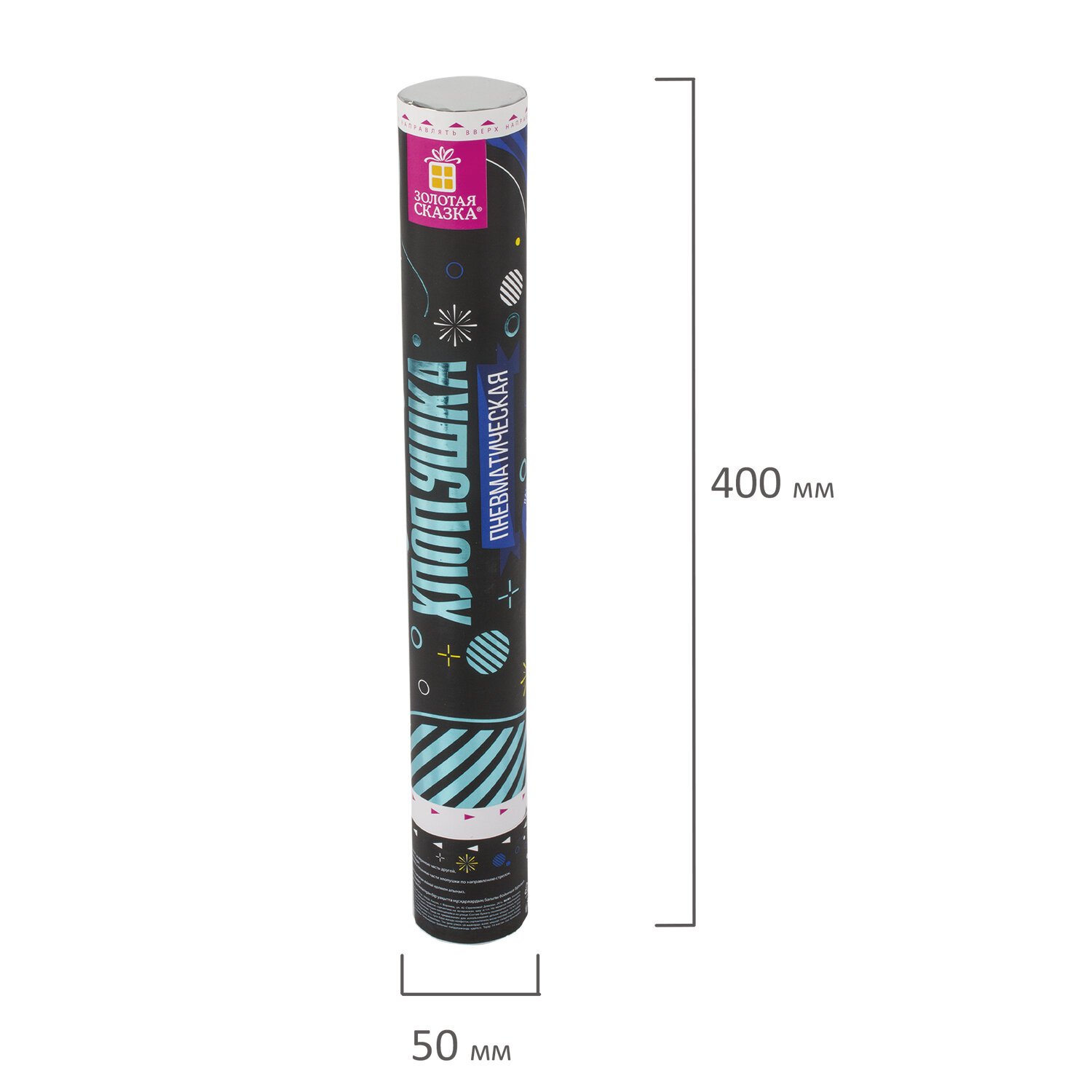 Хлопушка высотой 40 см с фольгированным наполнителем в виде звезд цвета ассорти является абсолютно безопасной. Выстрел осуществляется под действием сжатого воздуха. Не является пиротехникой. Средняя дальность выстрела – 5-7 м. Корпус хлопушки состоит из двух частей: пневматического баллона со сжатым воздухом и картонного цилиндра с наполнителем. Рекомендуется использовать хлопушку внутри больших помещений или на улице.
