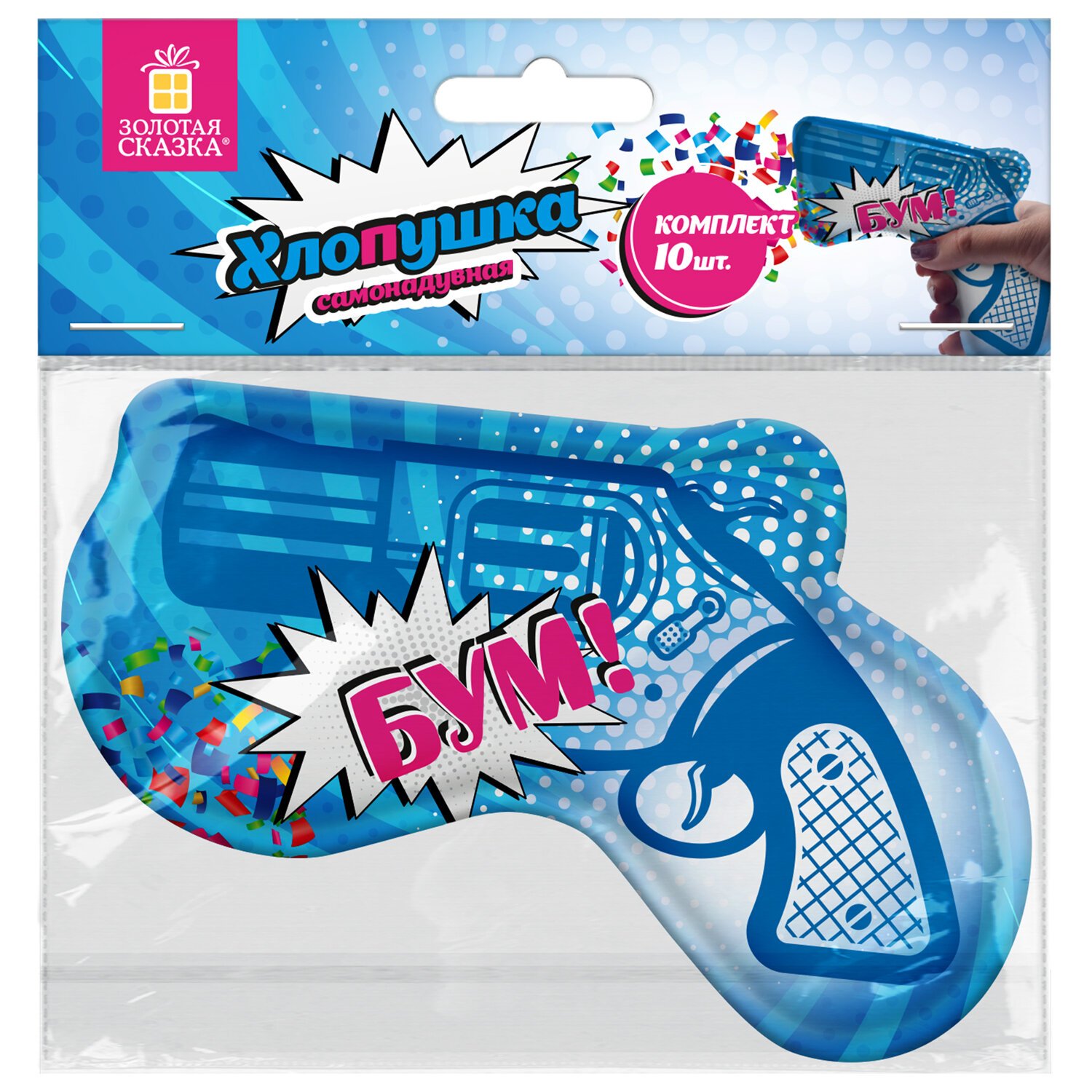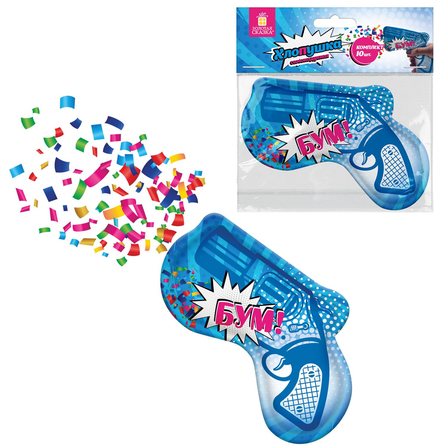 Хлопушка самонадувная КОМПЛЕКТ 10 штук "Пистолет с конфетти", фольга, бумага, ЗОЛОТАЯ СКАЗКА, 592462