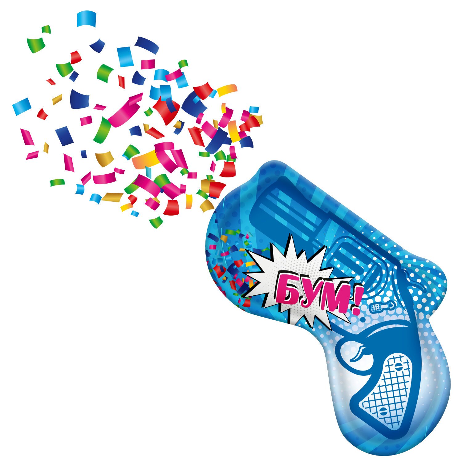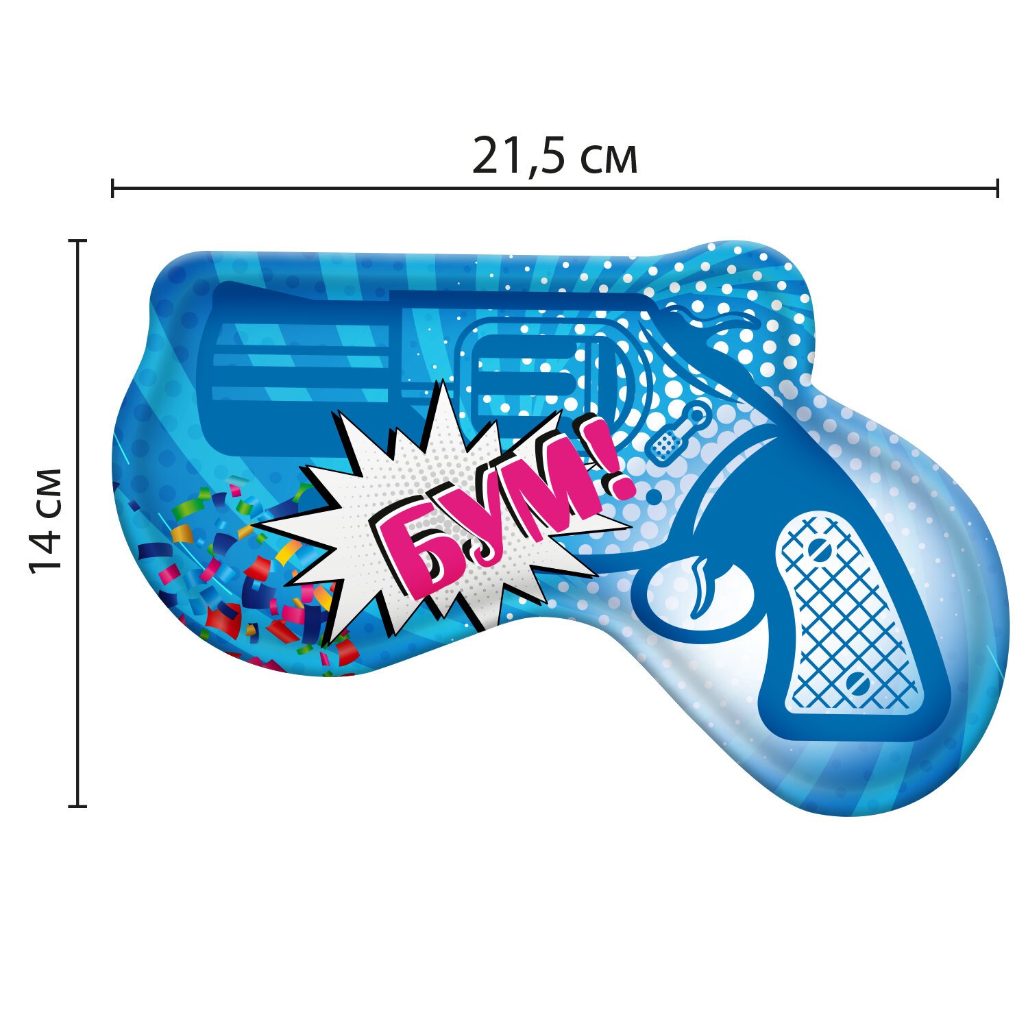 Изделие представляет собой хлопушку в виде пистолета. Материал – 100% полипропилен. Размер - 14х21,5 см. Удобная и легкая в использовании хлопушка: необходимо раздавить капсулу внутри, далее потрясите, после того как хлопушка наполнится воздухом - хлопните, путем нажатия на рукоятку.