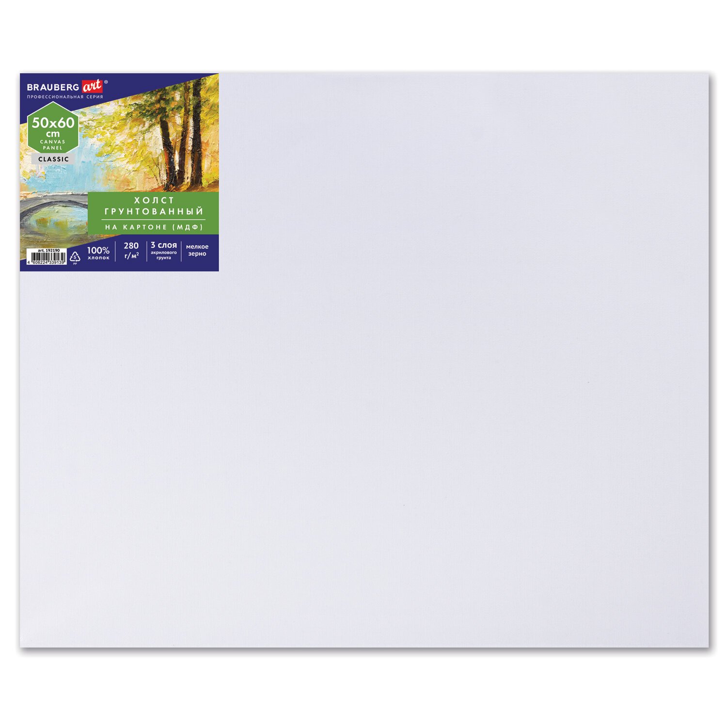 Холст на картоне (МДФ), 50х60 см, 280 г/м2, грунтованный, 100% хлопок, BRAUBERG ART CLASSIC, 192190