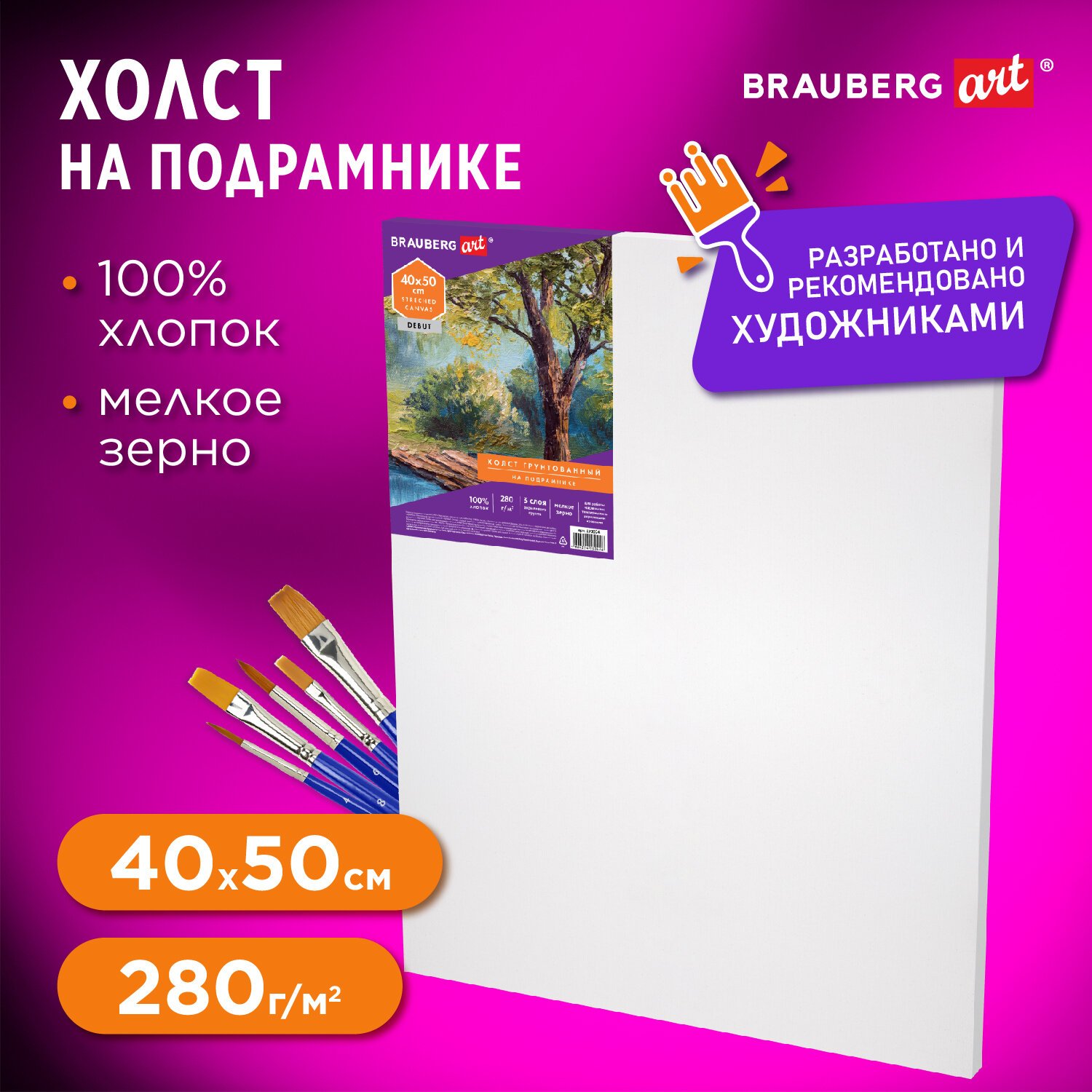 Холст на подрамнике BRAUBERG ART DEBUT, 40х50см, грунтованный, 100% хлопок, мелкое зерно, 191024