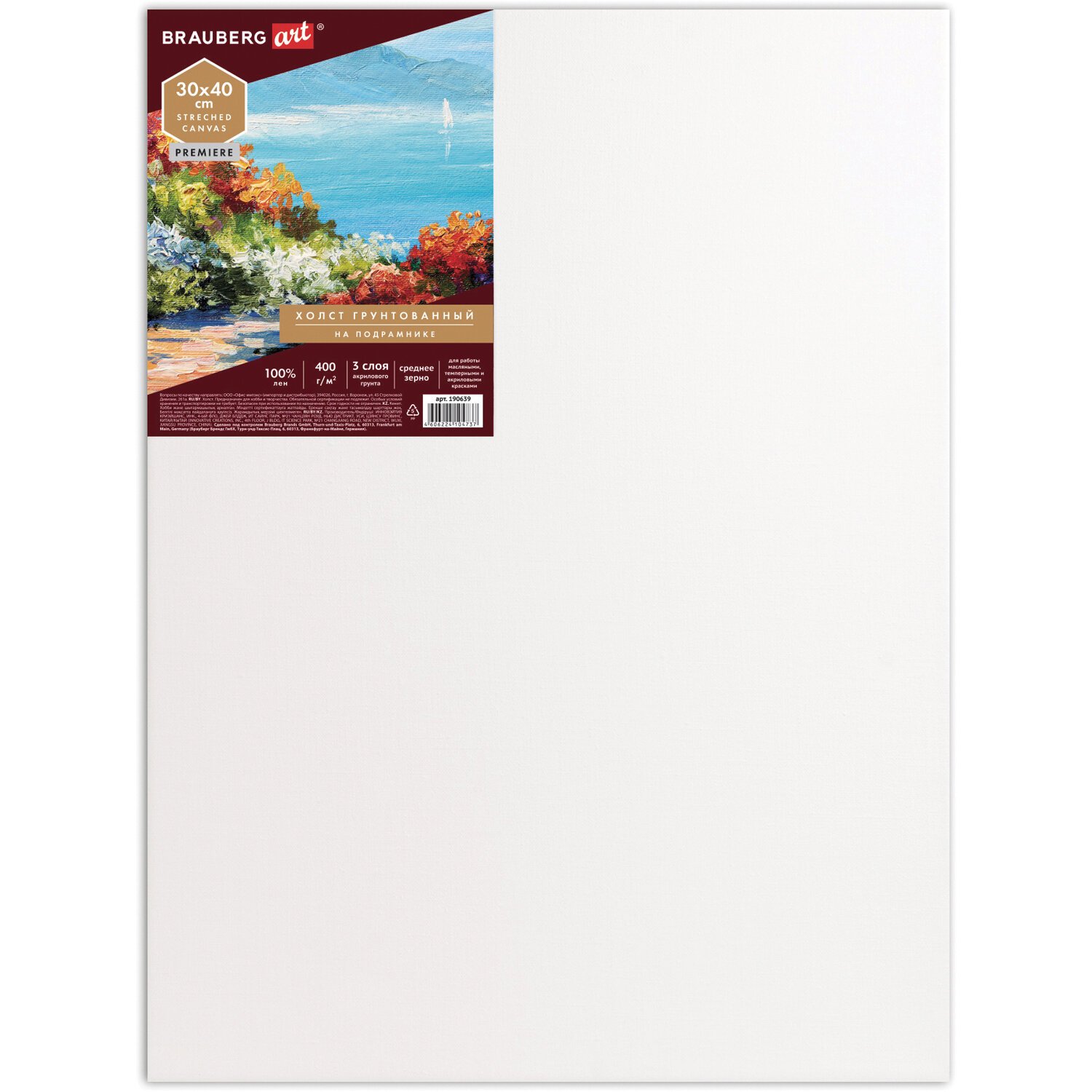 Холст на подрамнике BRAUBERG ART CLASSIC, 30х40 см, 420 г/м2, 45% хлопок 55% лен, среднее зерно, 191656