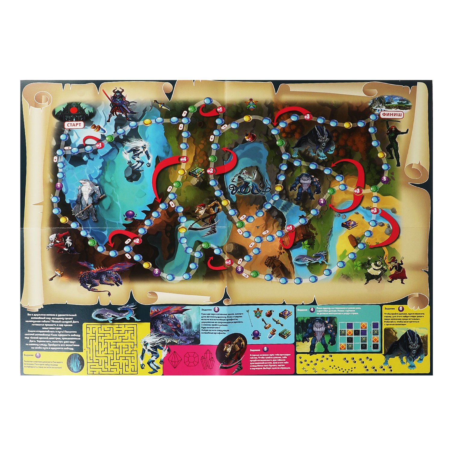 В комплекте игровое поле 42х58 см, кубик, 4 фишки.