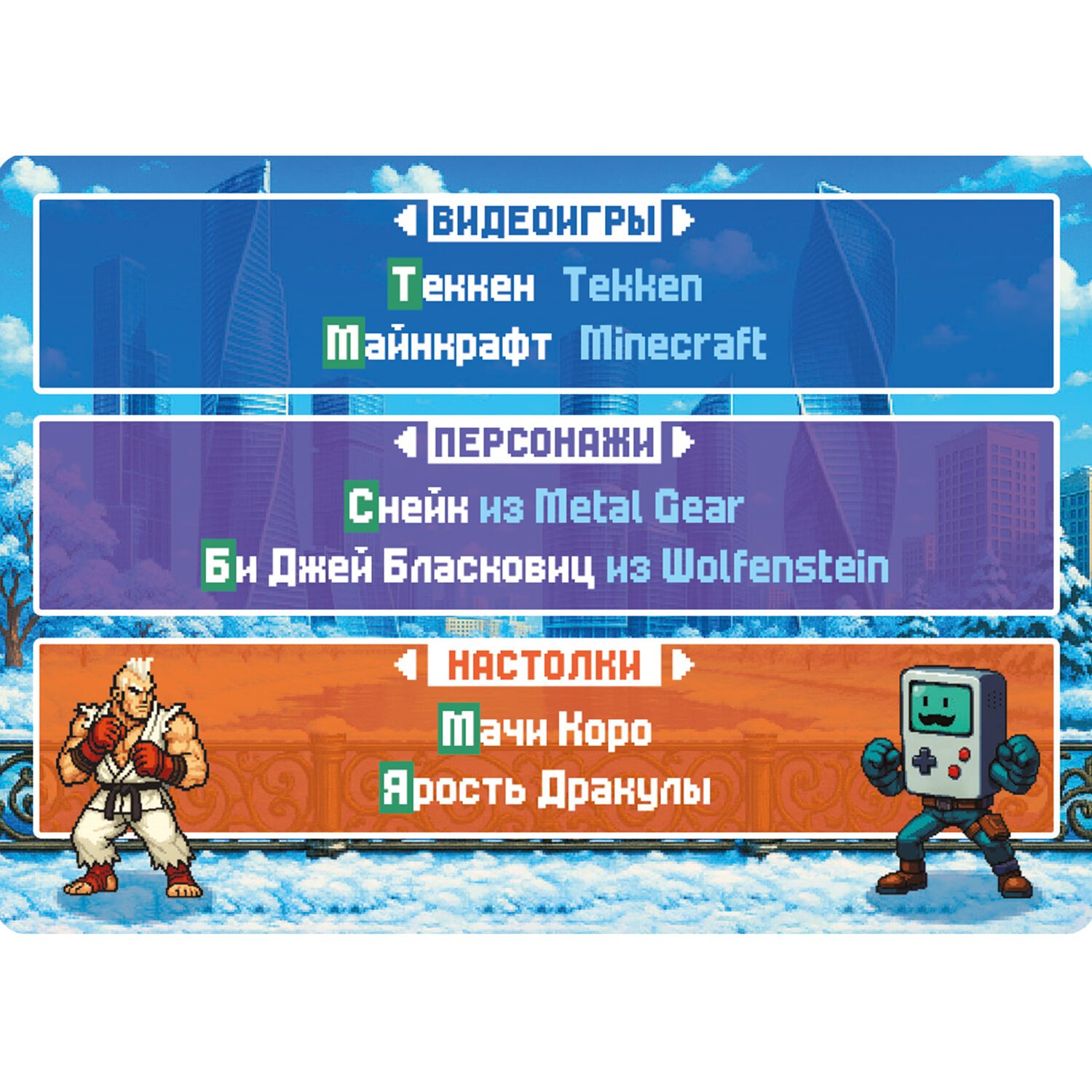 "В двух словах: Игры" – это увлекательная настольная игра, где вам предстоит объяснять названия и имена всего двумя словами, начинающимися на определённые буквы. В основе игры три раунда, и каждый – это новое испытание для вашей смекалки и эрудиции. Выбирайте карту, смотрите на цветные буквы невыбранных квестов и придумывайте ассоциации, которые приведут к победе.