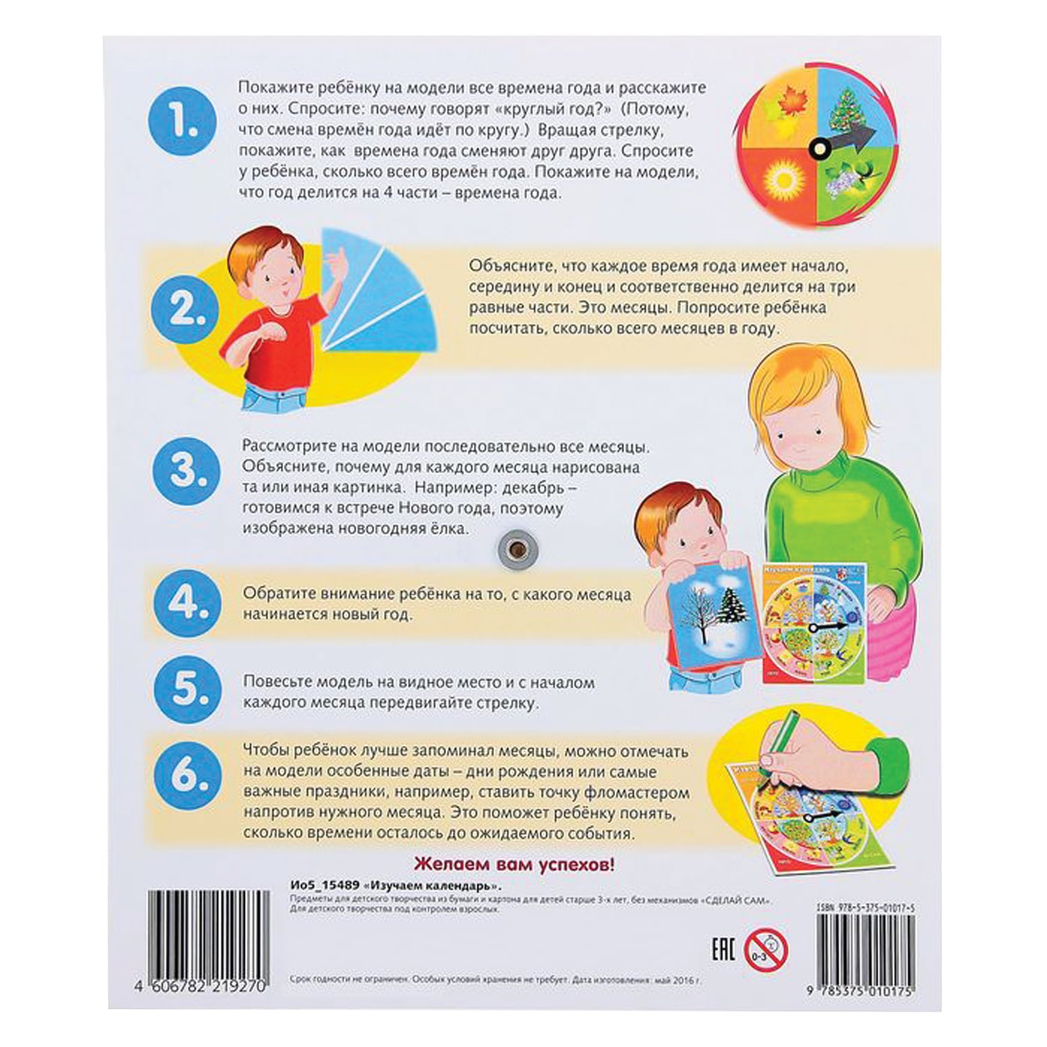 "Изучаем календарь" - это детская игра в виде макета с двигающейся стрелкой. Модель поможет малышу запомнить месяцы и их порядок. Рядом с их названиями размещены соответствующие картинки-ассоциации, которые облегчат ребенку процесс запоминания.