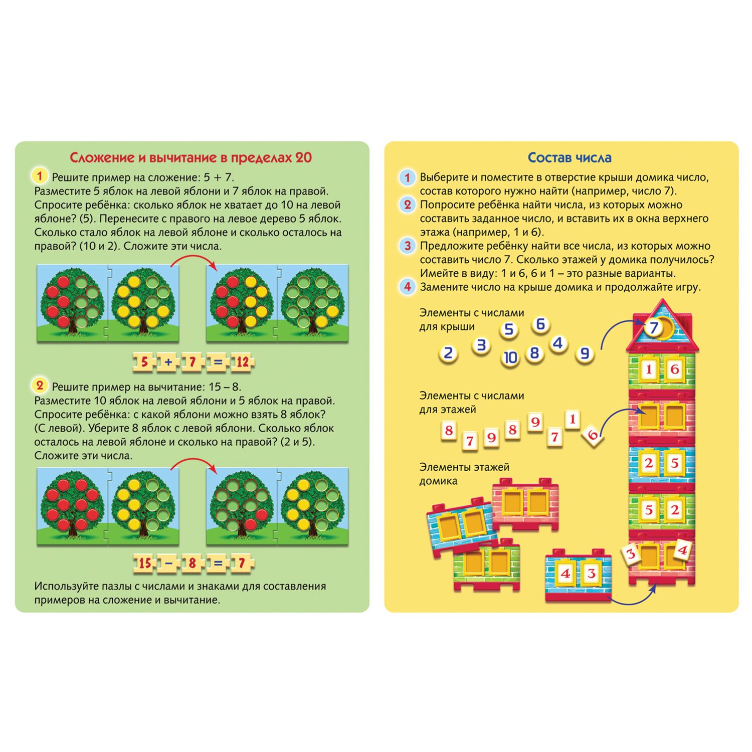 Обучающая игра для детей HATBER создана по принципу пазла. Эта красочная увлекательная игра поможет ребенку быстро и легко научиться составлять слова из букв и слогов, складывать и вычитать в пределах 20, находить состав числа.