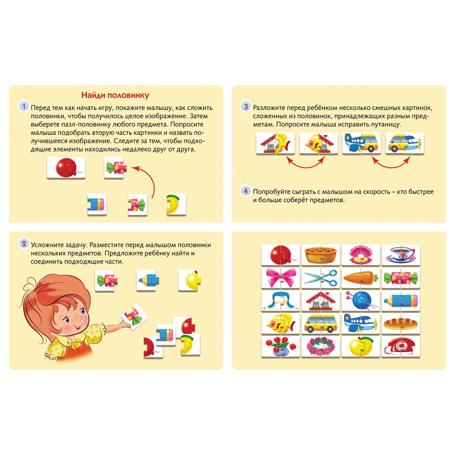 Наряду с развитием логики и формированием навыков чтения и счета дети будут развивать мелкую моторику, необходимую для совершенствования мышления и речи. Все элементы игр выполнены на плотном картоне. Внутри коробки с игрой находится инструкция с простыми правилами. Поставляется в нескольких вариантах без возможности выбора.