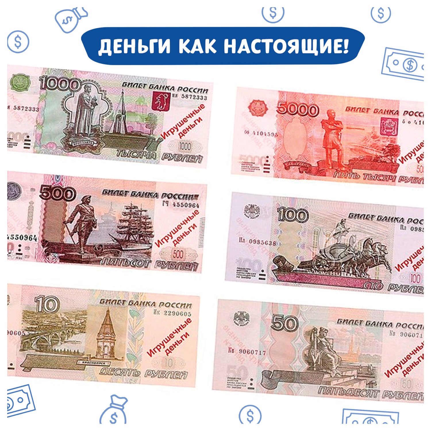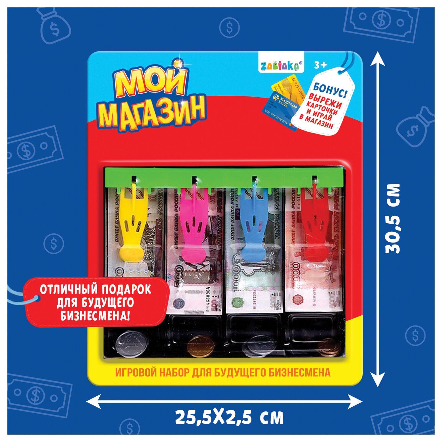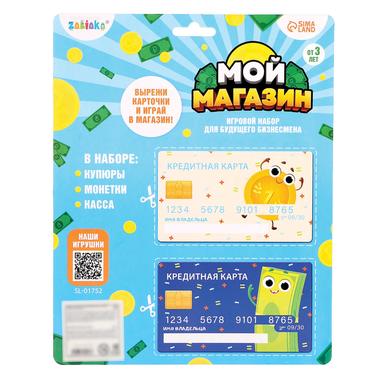 В наборе: купюры, монеты, пластиковая касса, 2 кредитные карточки из картона.