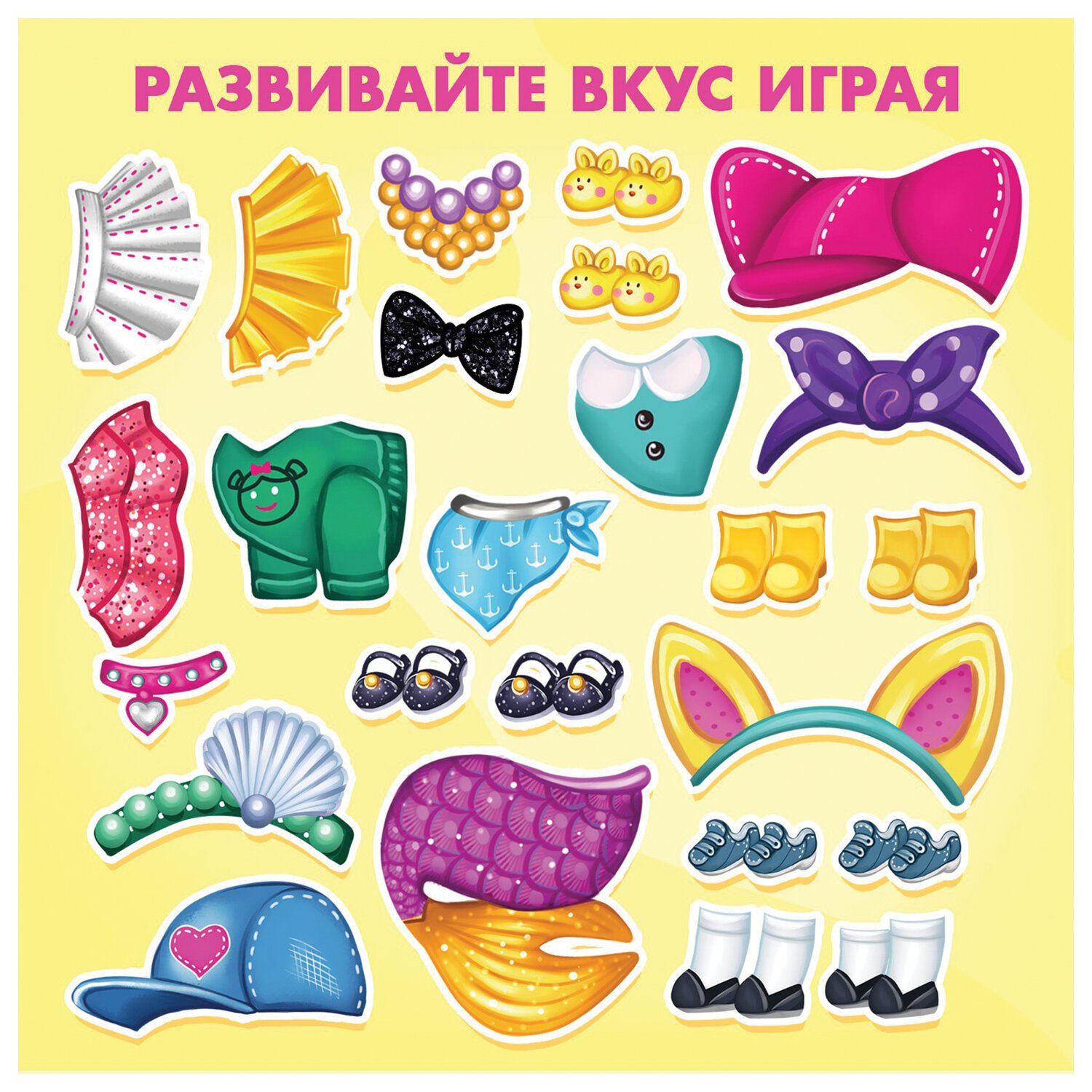 Играть с набором просто: снимите с листа подходящий наряд и аксессуары, а затем приложите их к питомцу. Одежда приклеится к модели благодаря магнитной ленте.