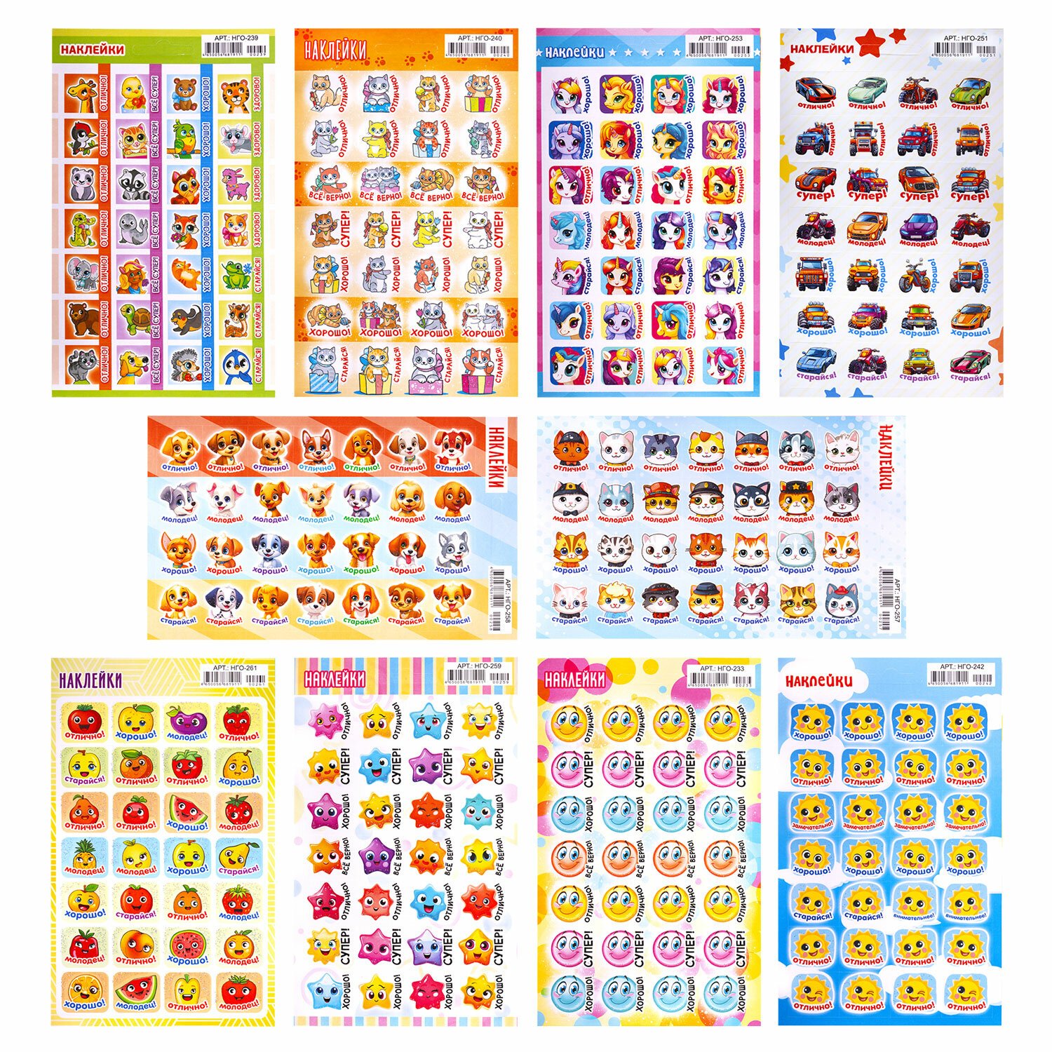 В наборе содержатся 10 листов с более чем 230 дизайнами, которые понравятся детям. Многообразие дизайнов позволяет использовать наклейки для мотивации и девочек, и мальчиков. Наклейки отличаются высочайшим качеством печати и цветопередачи.
