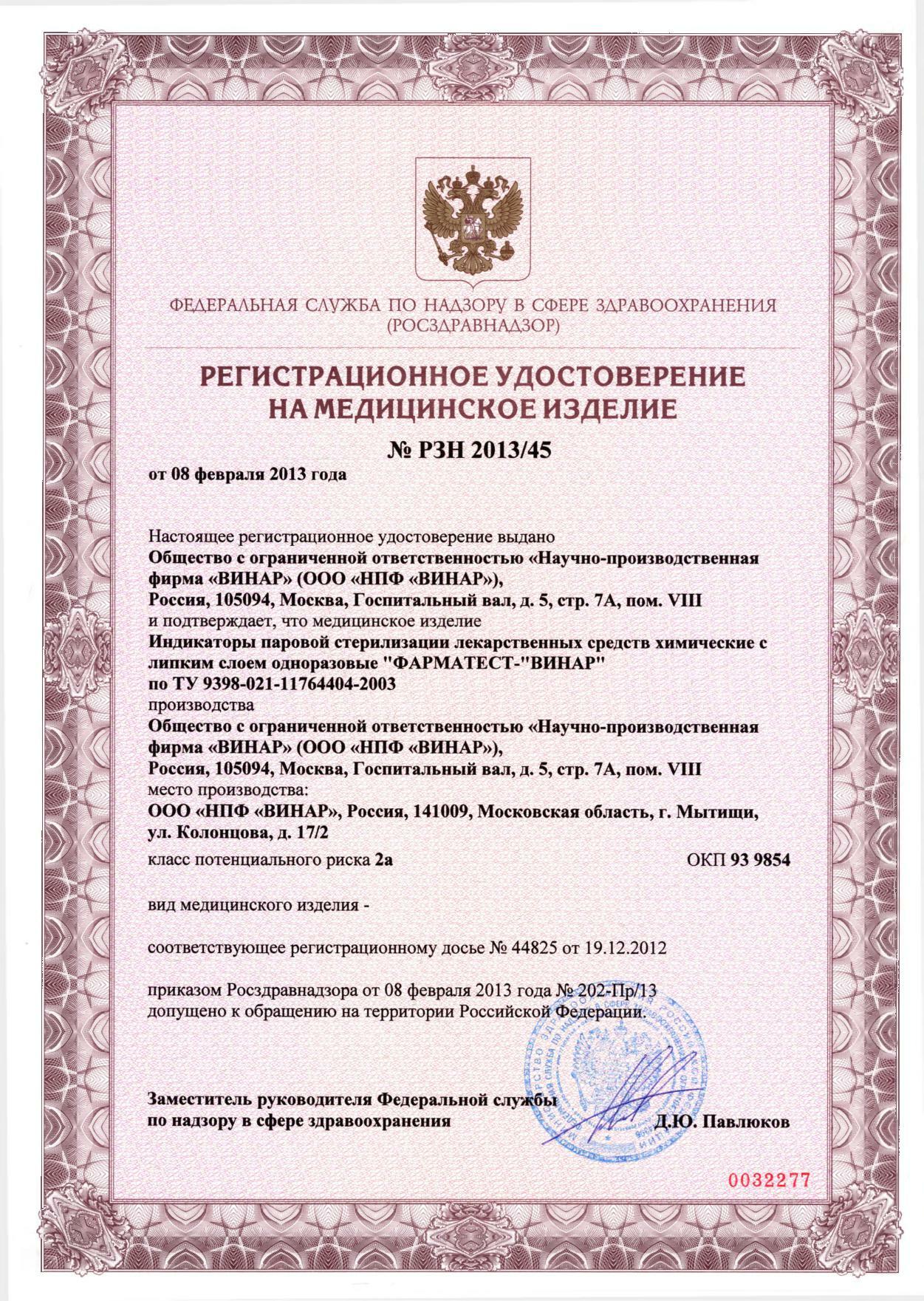 Регистрационные удостоверения №РЗН 2013/045 от 08.02.2013.