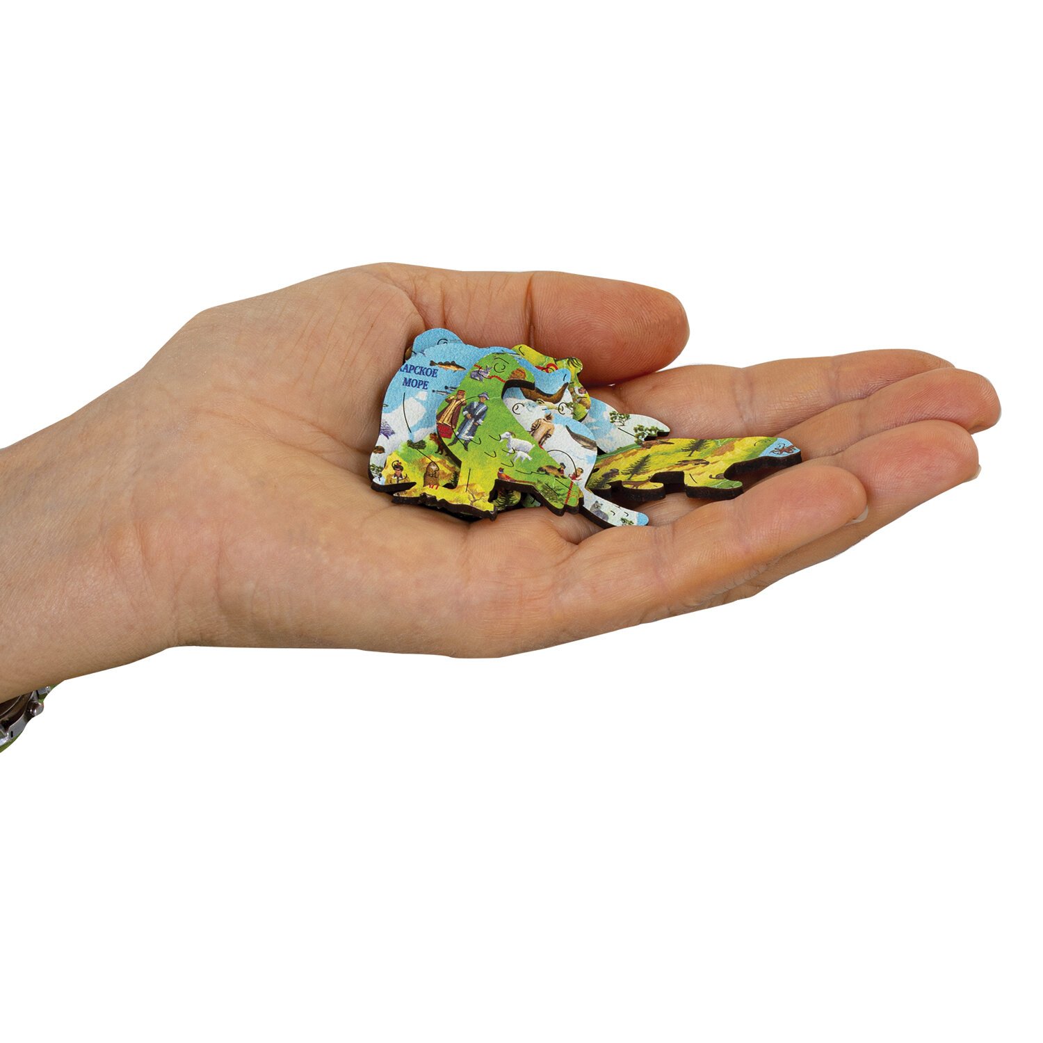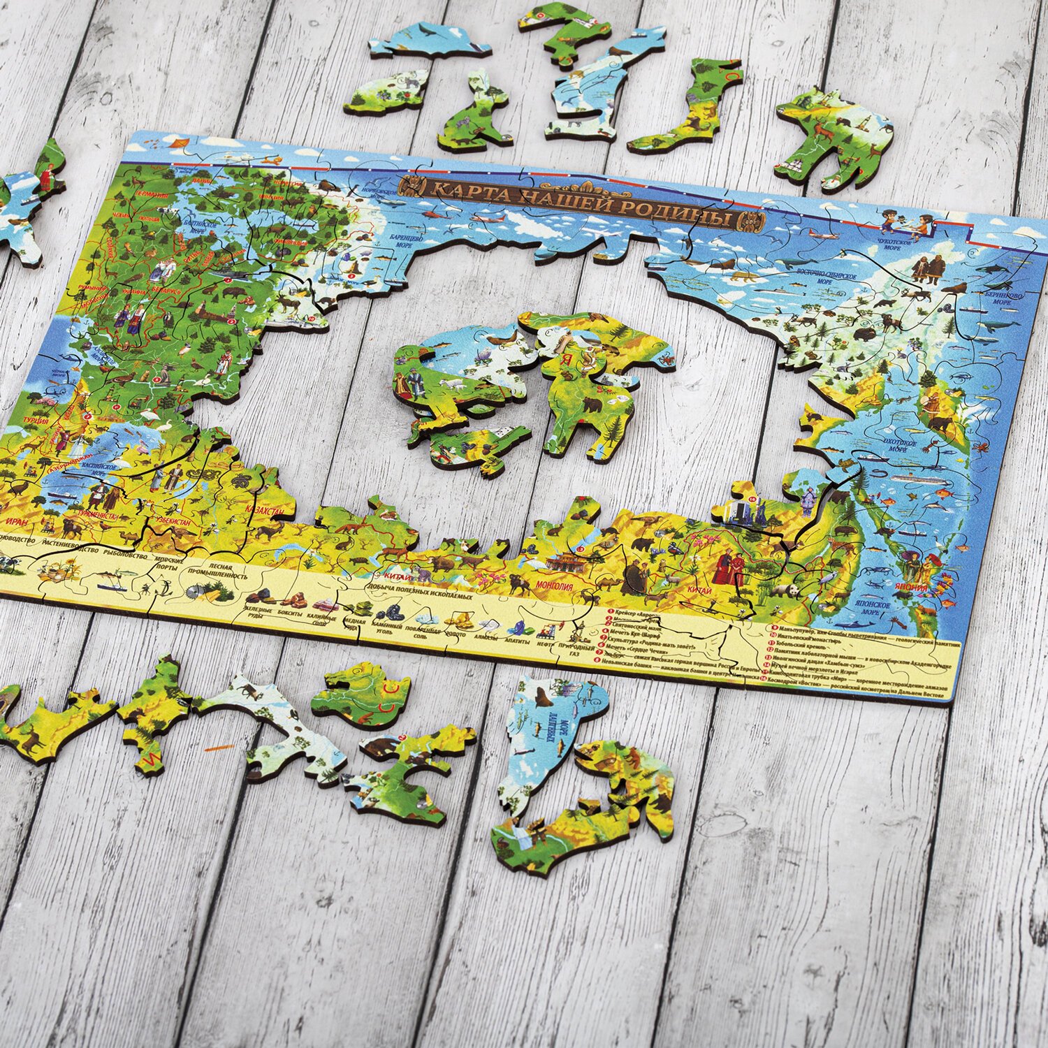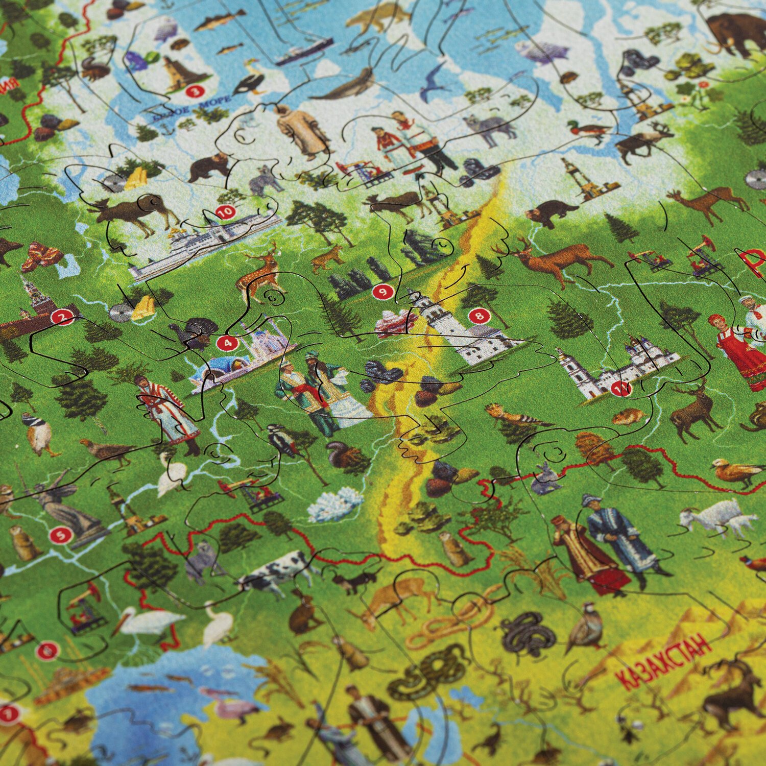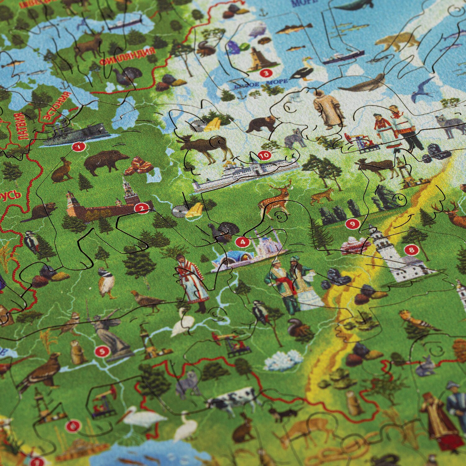 Пазл состоит из 100 деталей, каждая из которых является уникальной. Детали вырезаются высокоточным лазером, что гарантирует отличную подгонку деталей, а также ровные кромки, это исключит возможность пораниться. Интерактивные помощники покажут и расскажут об особенностях ландшафта, о достопримечательностях разных городов, о животных и растениях, об исторических важных событиях, о путешественниках и исследователях, о народах населяющих Россию и прилегающие государства.