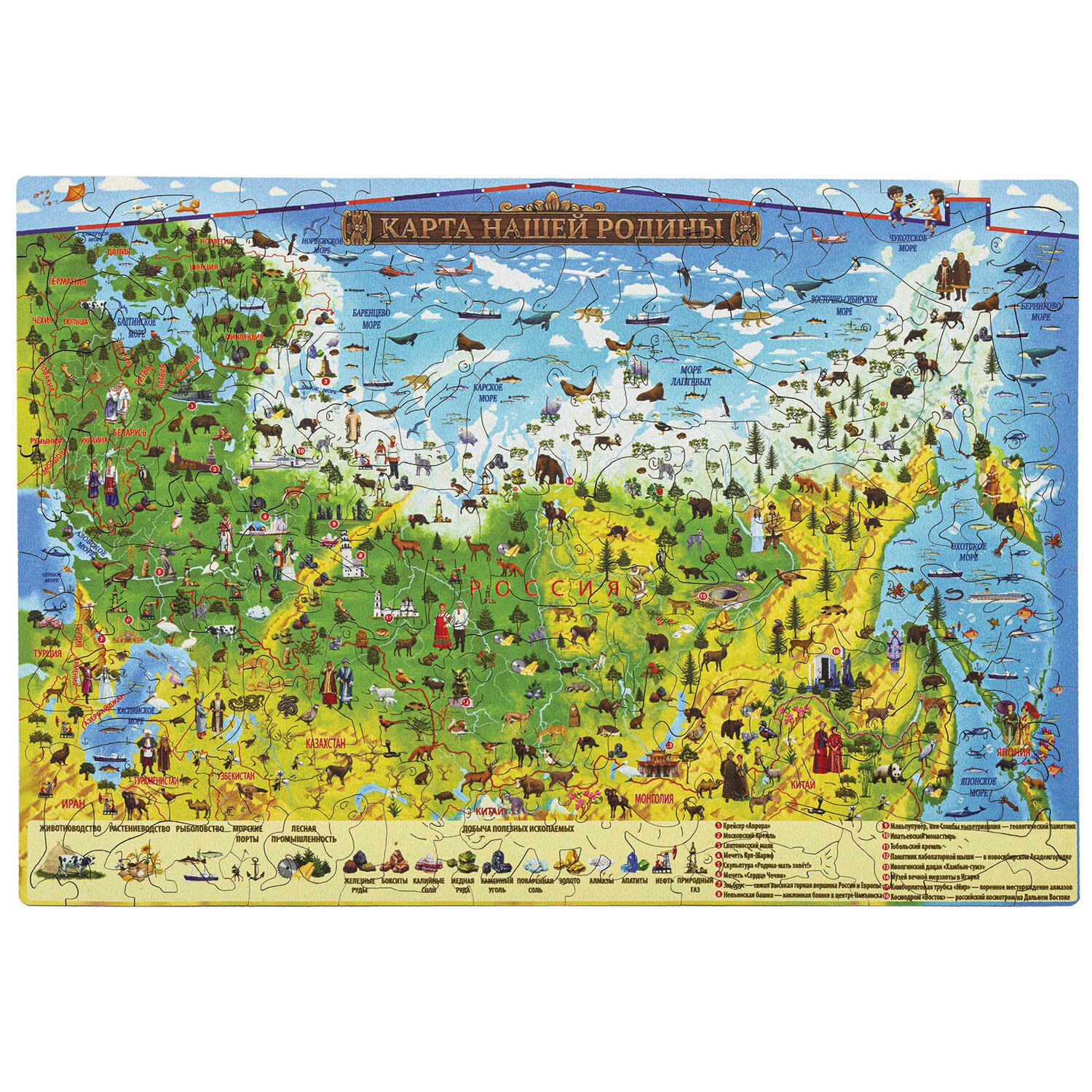 Интерактивная карта-пазл для детей "Карта нашей Родины" Globen расскажет о населяющих Россию и страны СНГ народах, об обитателях пустынь, степей и лесов, об исторических открытиях и великих событиях.