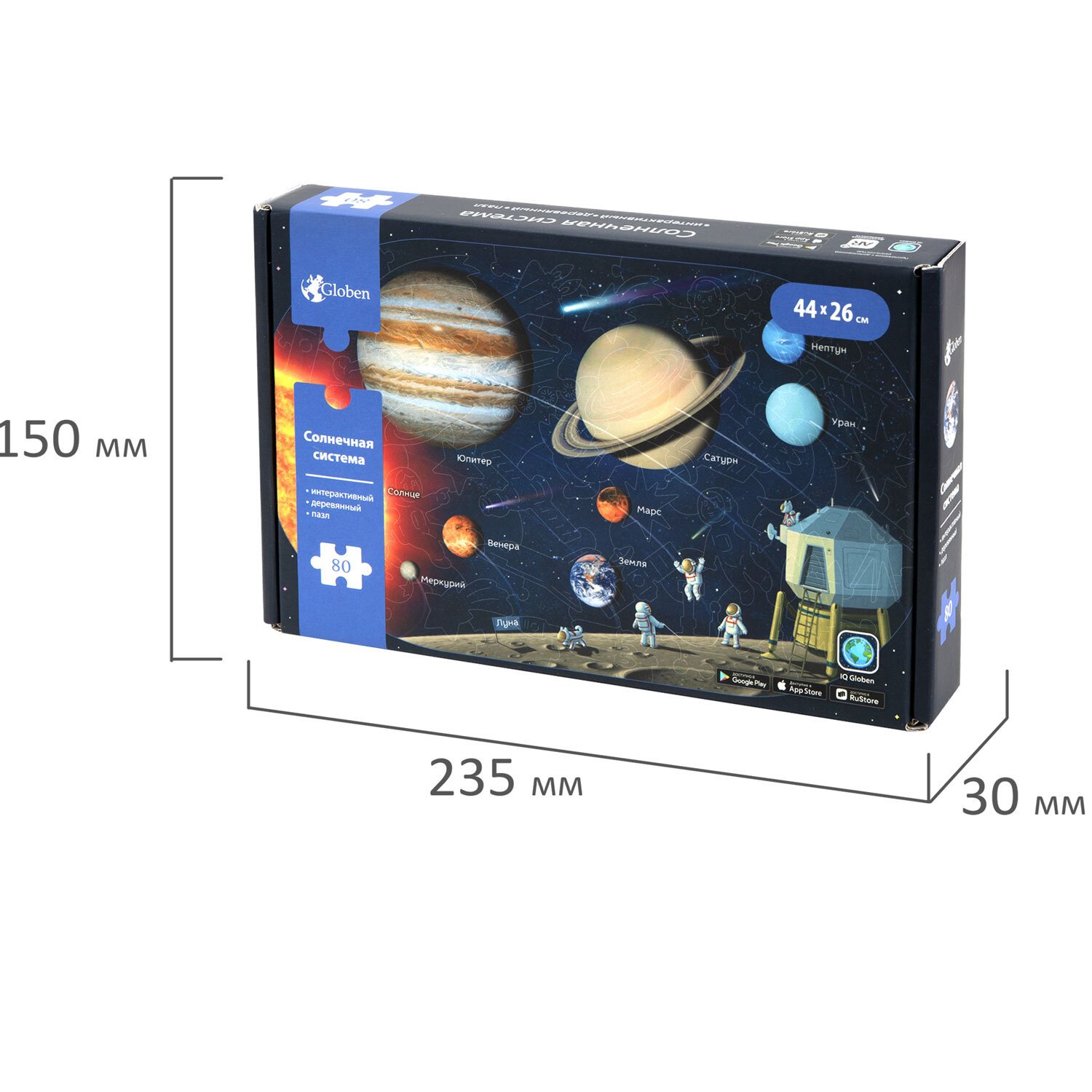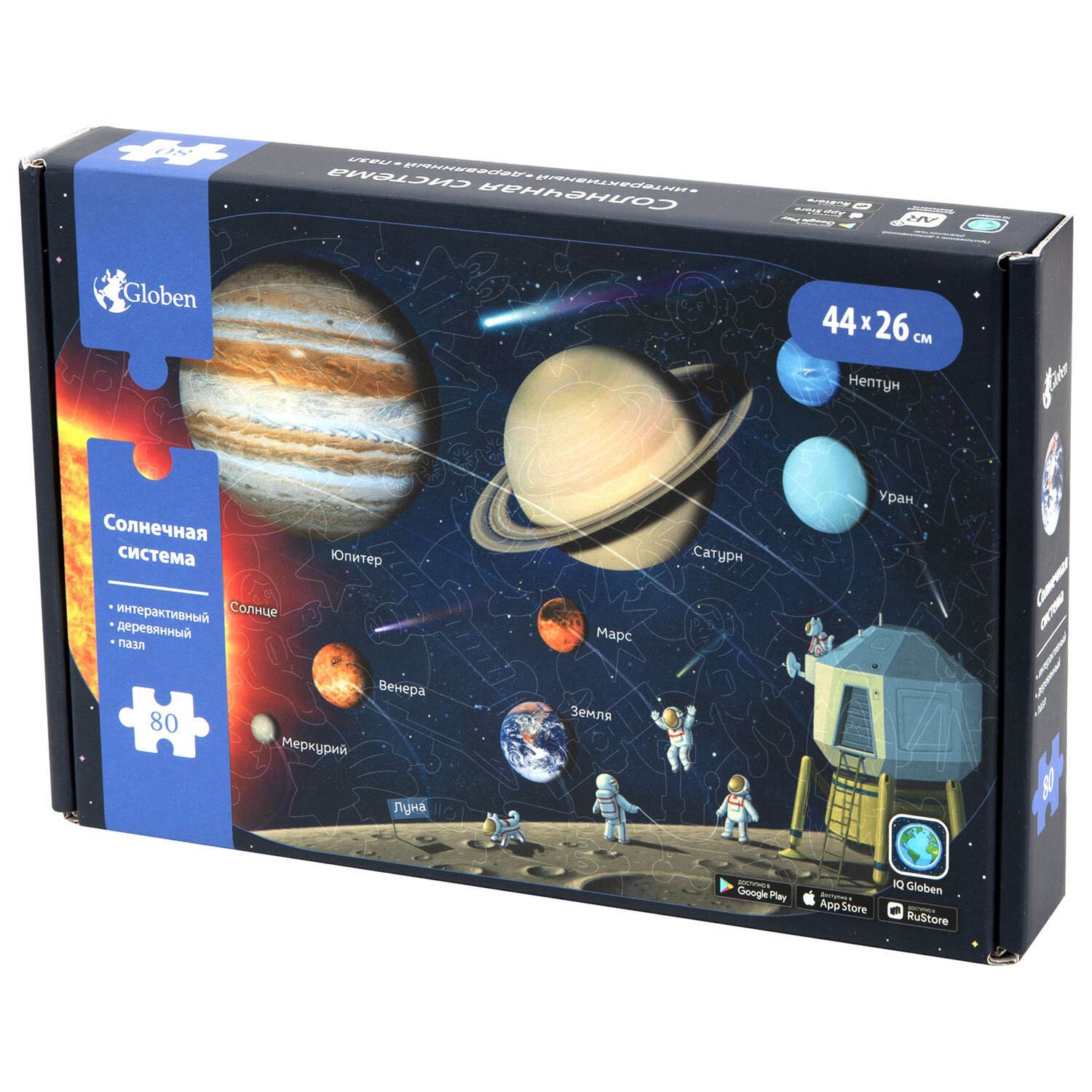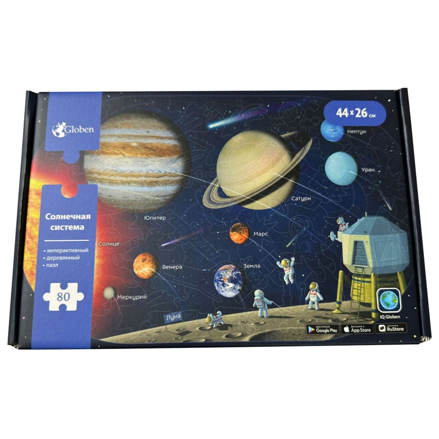 Пазл состоит из 80 деталей, каждая из которых является уникальной. Имеет большой размер – 44х26 см. Детали вырезаются высокоточным лазером, что гарантирует отличную подгонку деталей, а также ровные кромки – это исключит возможность пораниться. Подробная карта планет Солнечной системы с реалистичными изображениями каждой планеты.