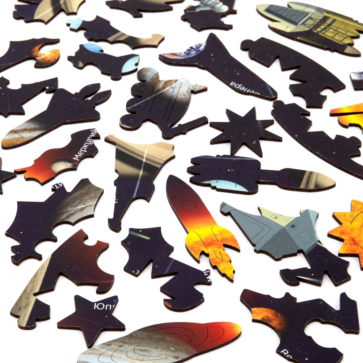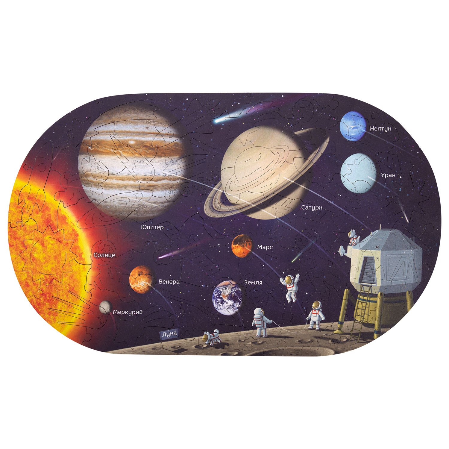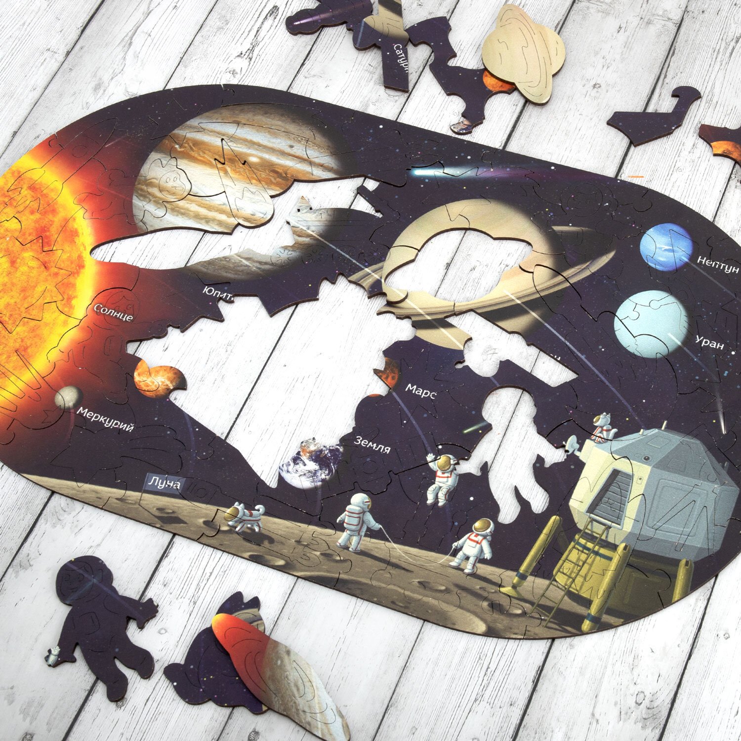 Пазл состоит из 80 деталей, каждая из которых является уникальной. Имеет большой размер – 44х26 см. Детали вырезаются высокоточным лазером, что гарантирует отличную подгонку деталей, а также ровные кромки – это исключит возможность пораниться. Подробная карта планет Солнечной системы с реалистичными изображениями каждой планеты.