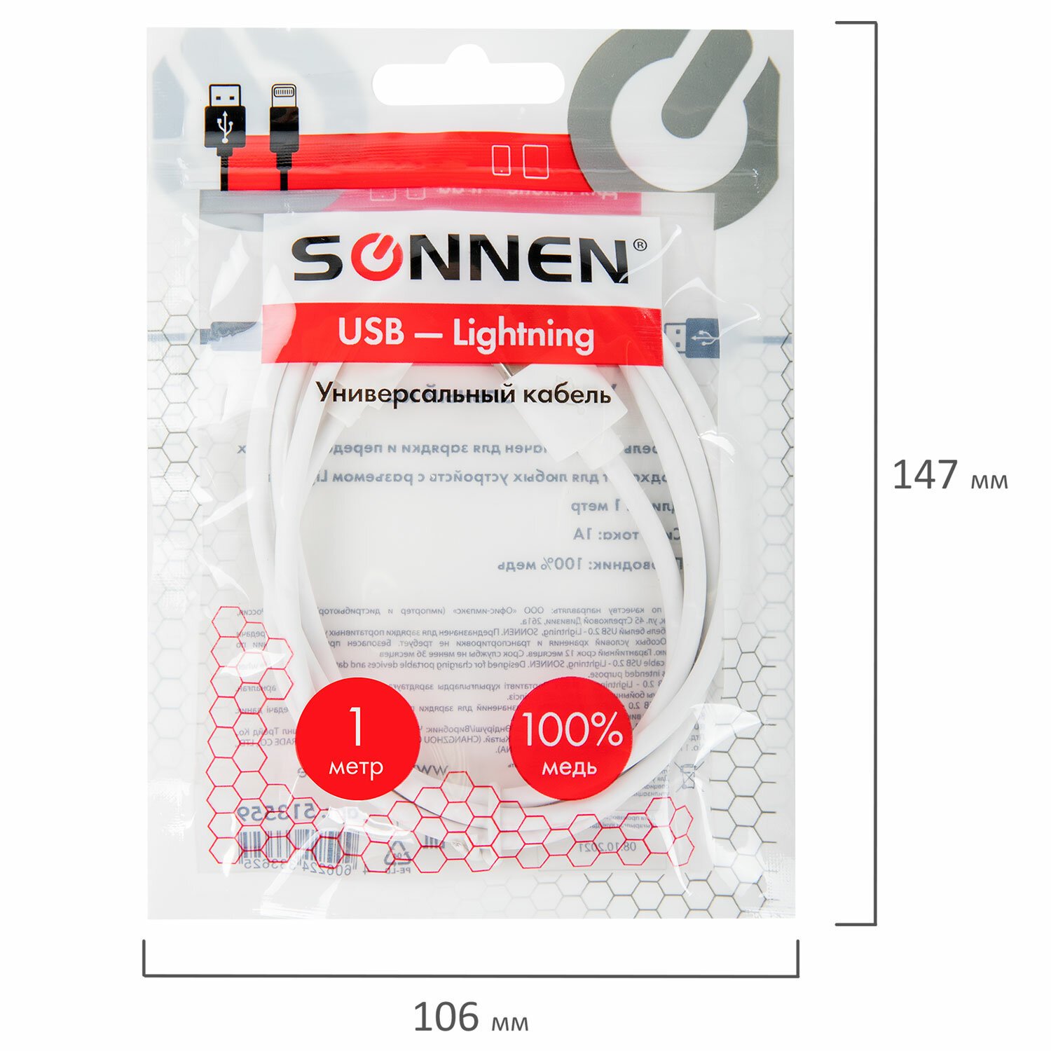 Кабель USB 2.0-Lightning, 1 м, SONNEN Premium, медь, для передачи данных и зарядки, 513126