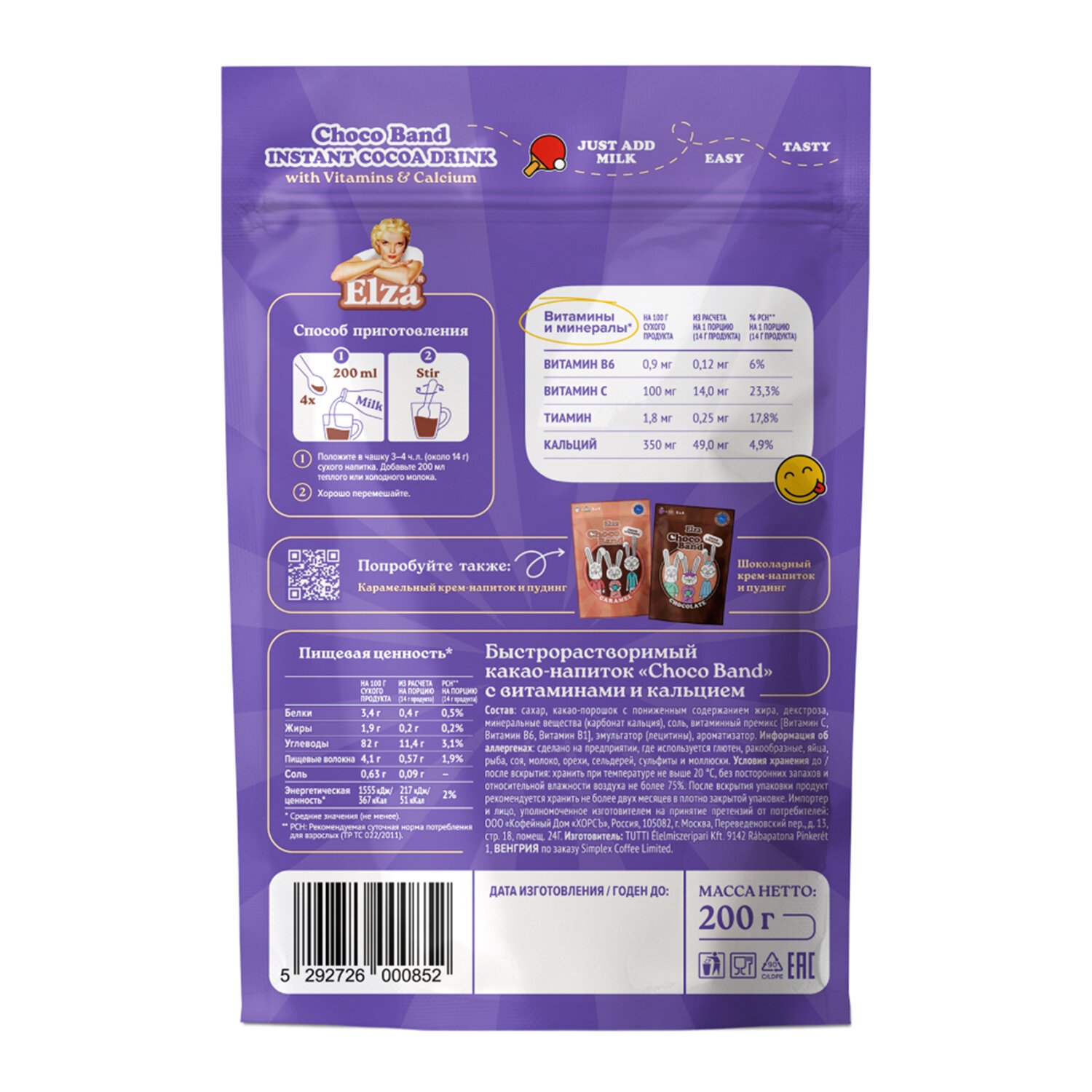 Какао-напиток растворимый ELZA "Choco Band" с витаминами и кальцием, 200 г.