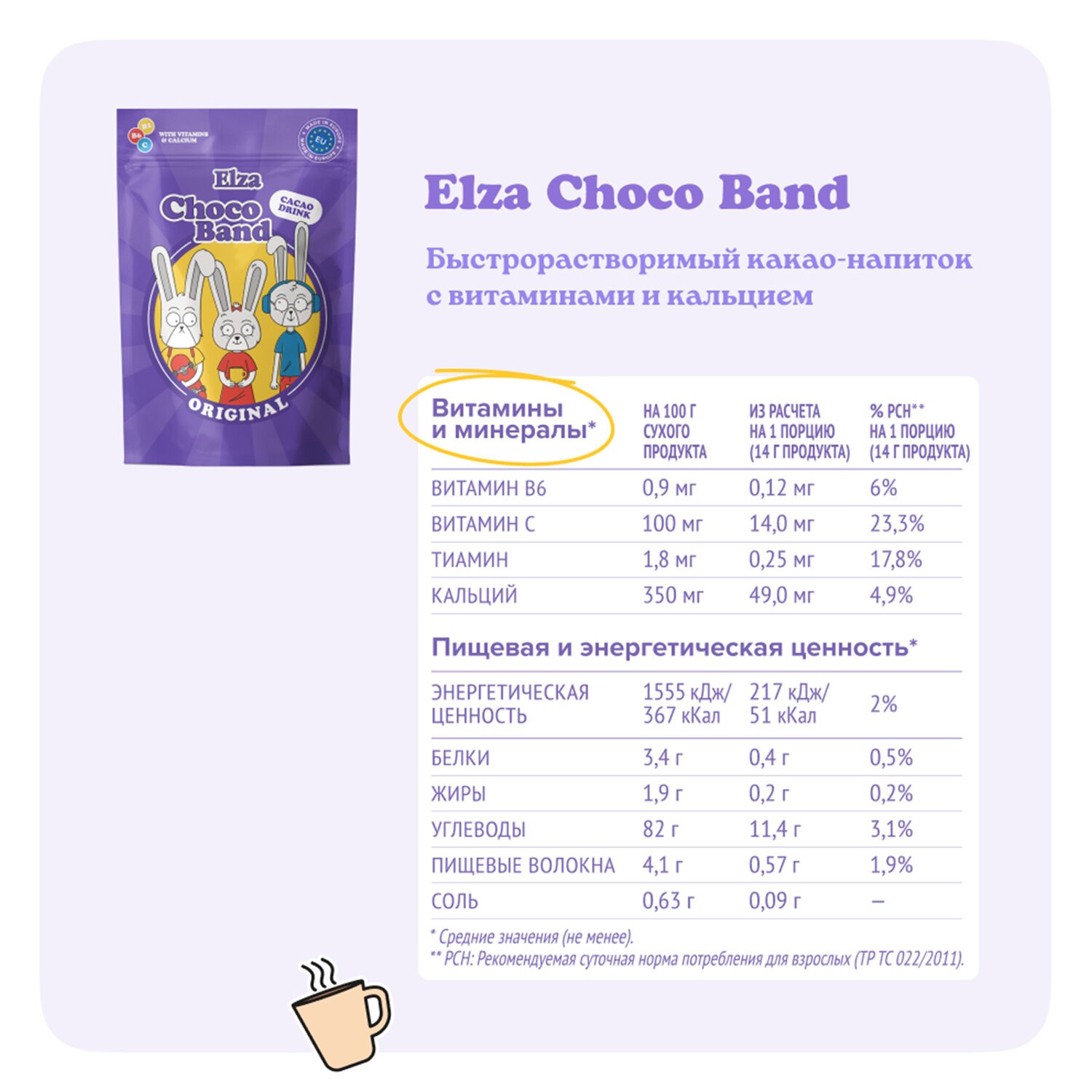 Быстрорастворимый какао-напиток ELZA Choco Band с витаминами и кальцием.