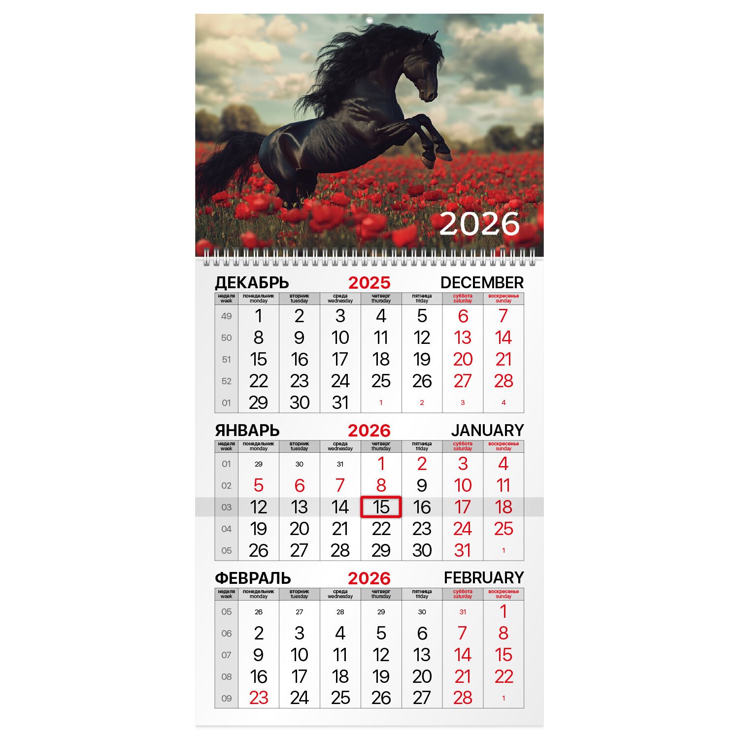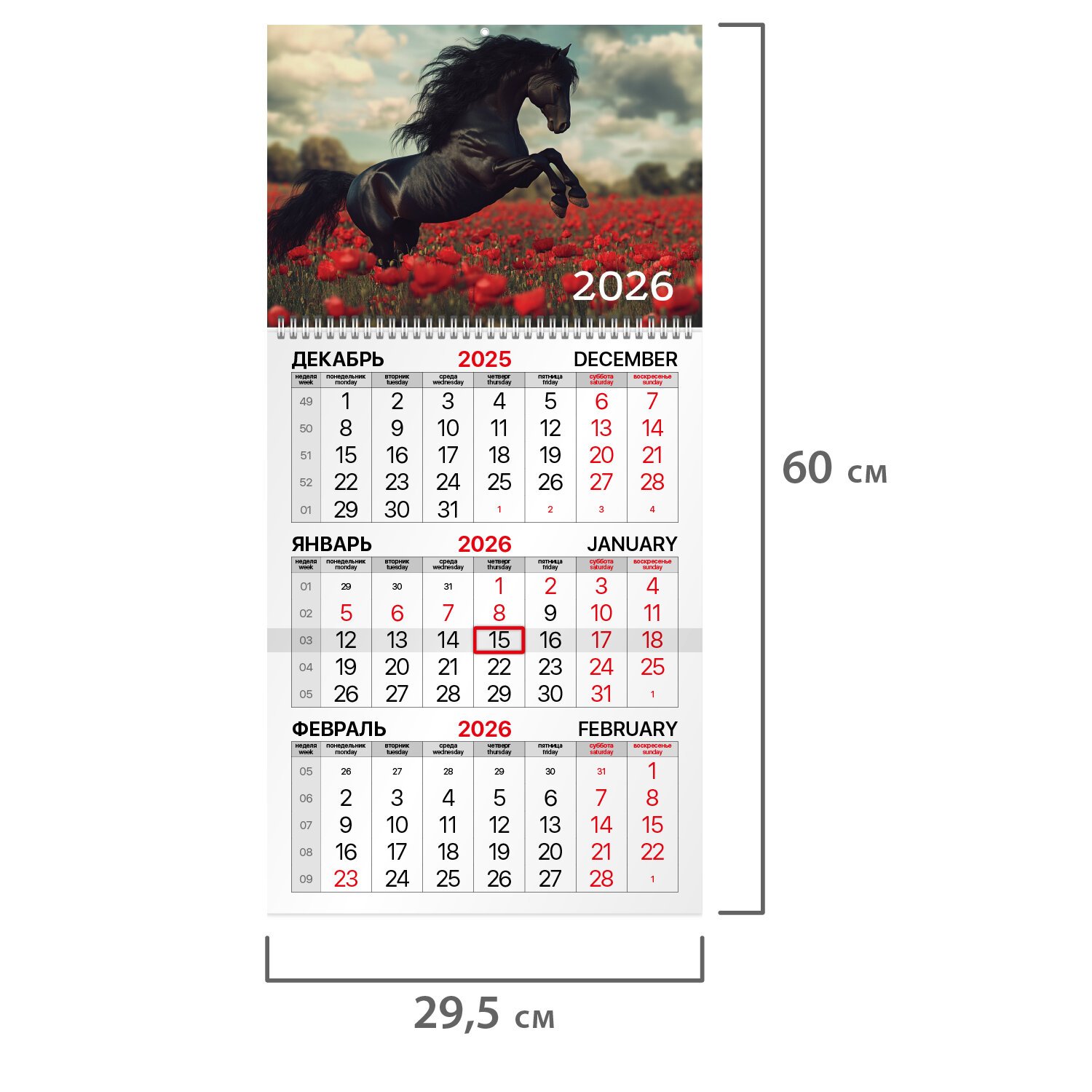 Календарь квартальный 2026г, 1 блок 1 гребень бегунок, офсет, BRAUBERG, Символ года 2, 116740