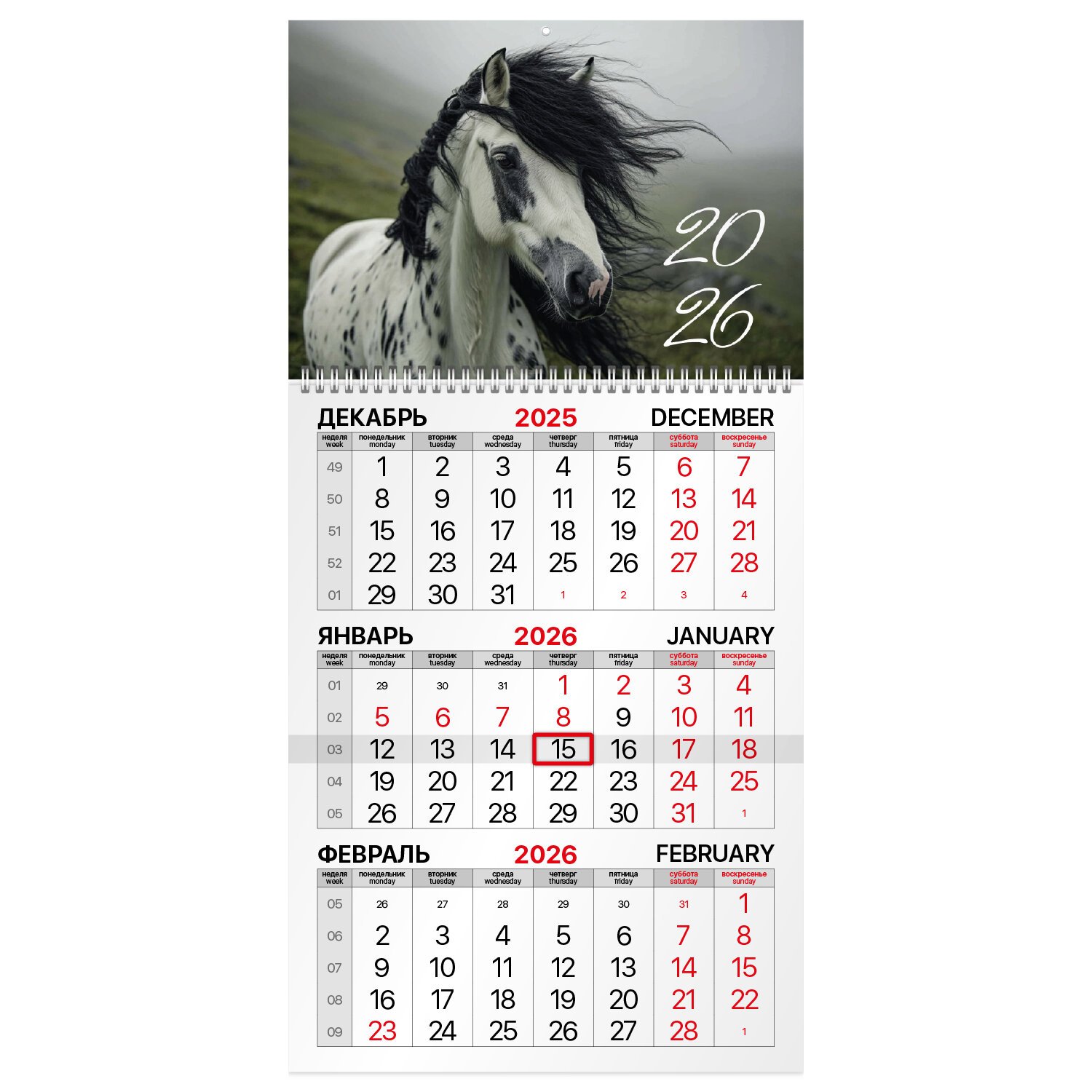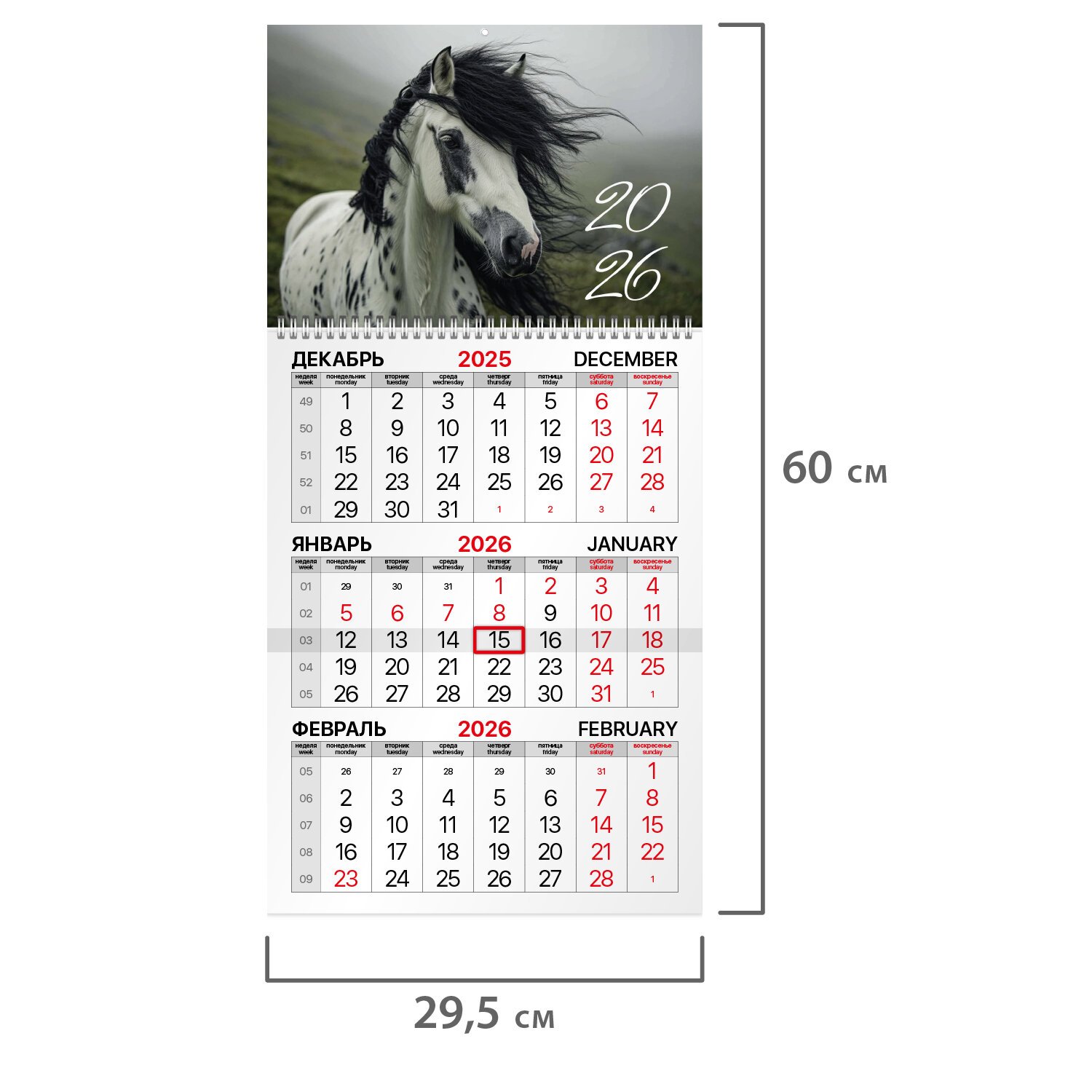 Офисный календарь на 2026 год на гребне. Состоит из 1 блока с календарными сетками на три месяца - предыдущего, текущего и последующего. Блок календаря напечатан на мелованной бумаге плотностью 80 г/м2. Подложка изготовлена из мелованного картона плотностью 280 г/м2. Курсор-бегунок выделяет текущую дату. Вертикальное расположение. Размер - 29,5х60 см.