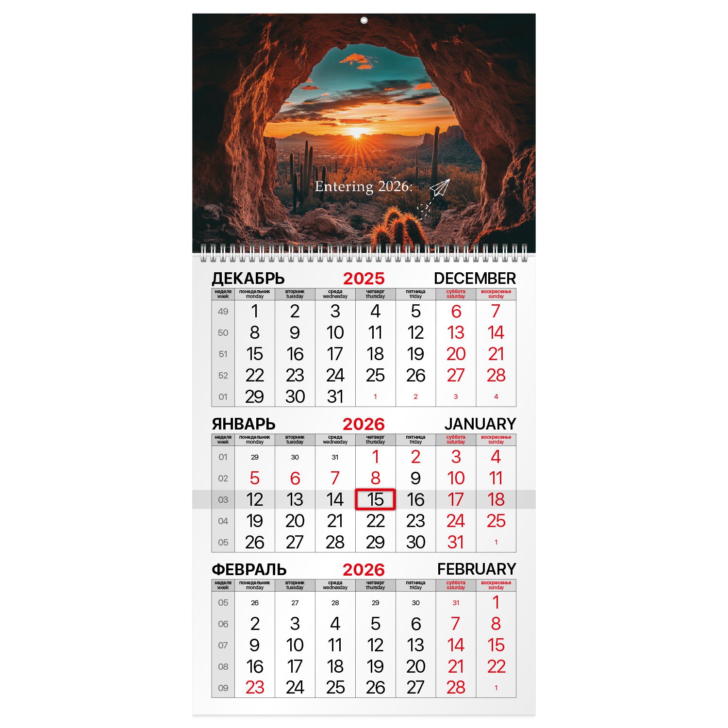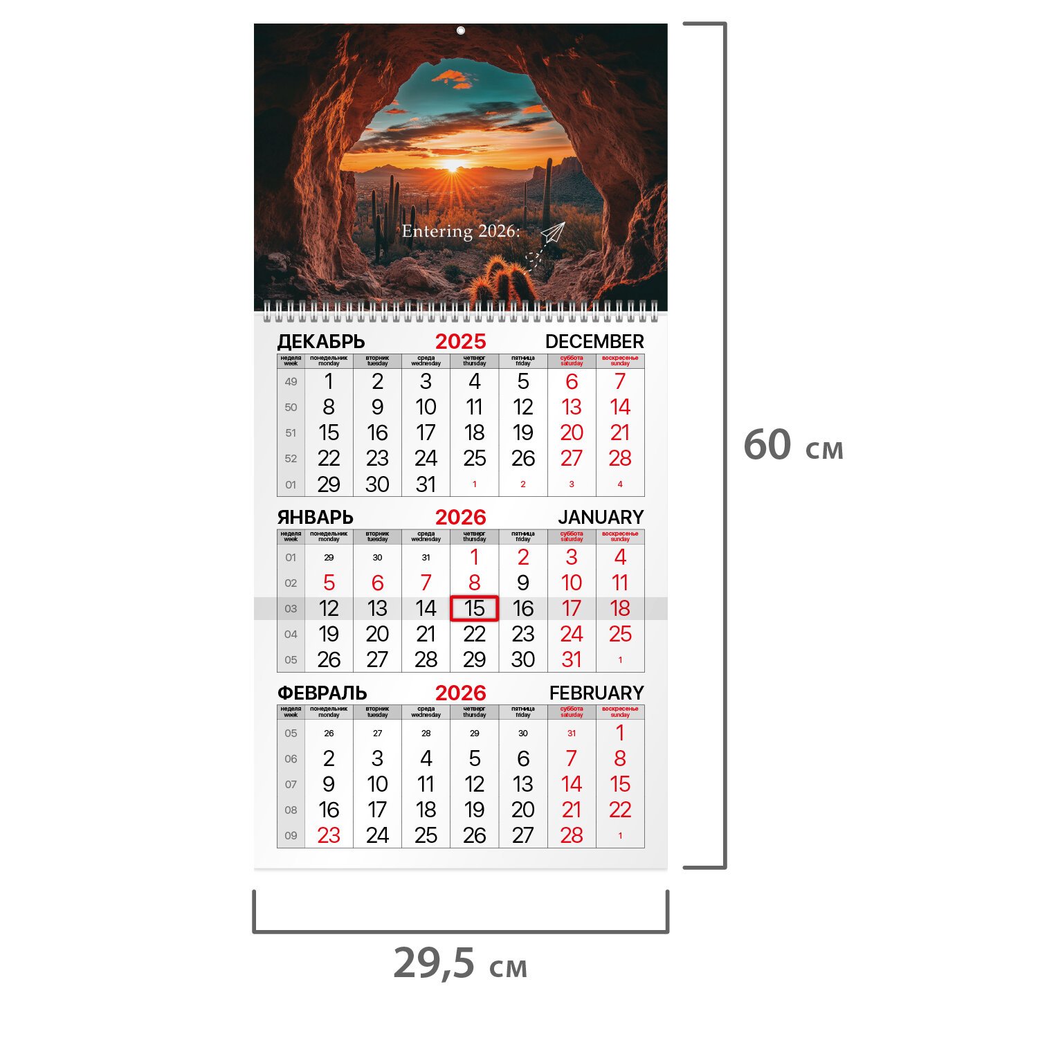 Офисный календарь на 2026 год на гребне. Состоит из 1 блока с календарными сетками на три месяца - предыдущего, текущего и последующего. Блок календаря напечатан на мелованной бумаге плотностью 80 г/м2. Подложка изготовлена из мелованного картона плотностью 280 г/м2. Курсор-бегунок выделяет текущую дату. Вертикальное расположение. Размер - 29,5х60 см.