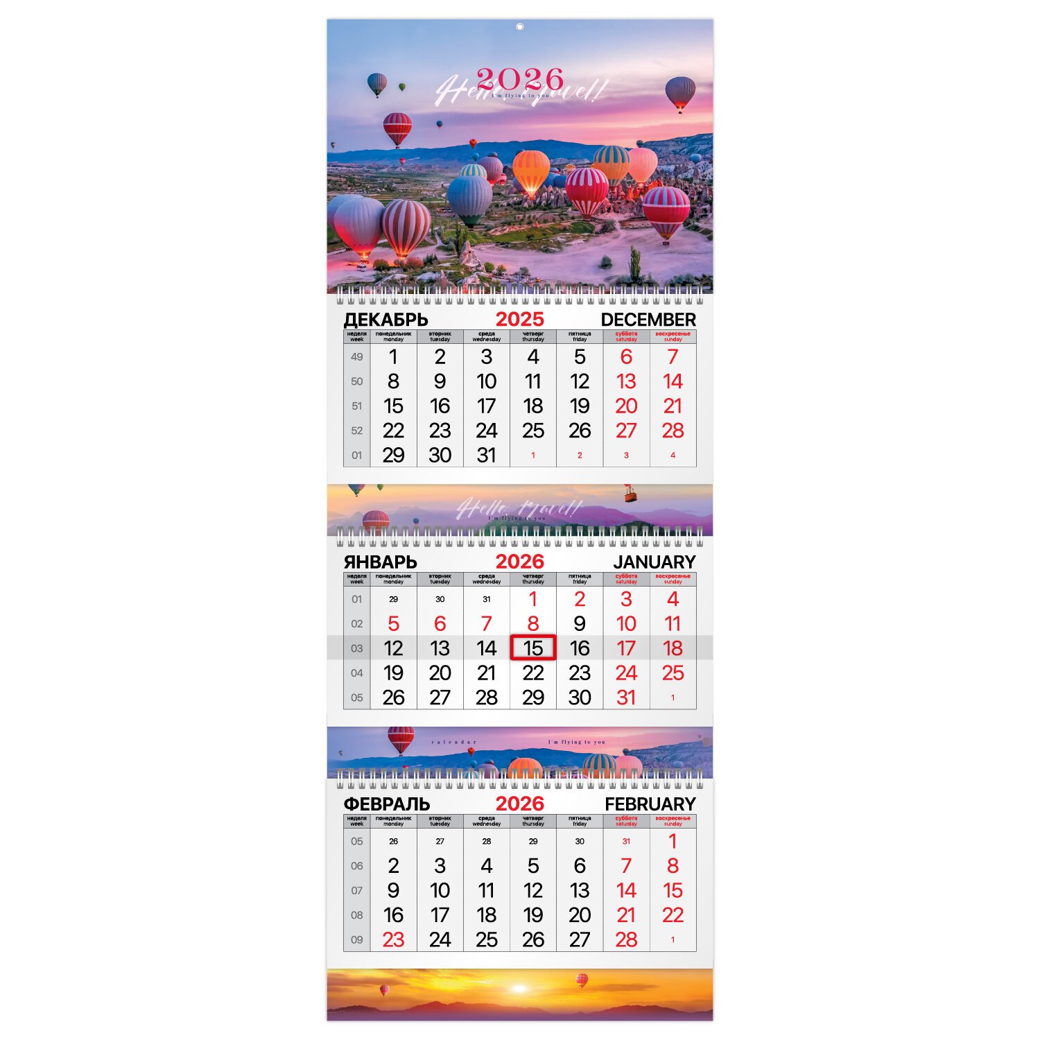 Офисный календарь на 2026 год на 3 гребнях. Для удобства планирования состоит из 3 блоков с календарными сетками на три месяца – предыдущий, текущий и следующий. Курсор-бегунок выделяет текущую дату.