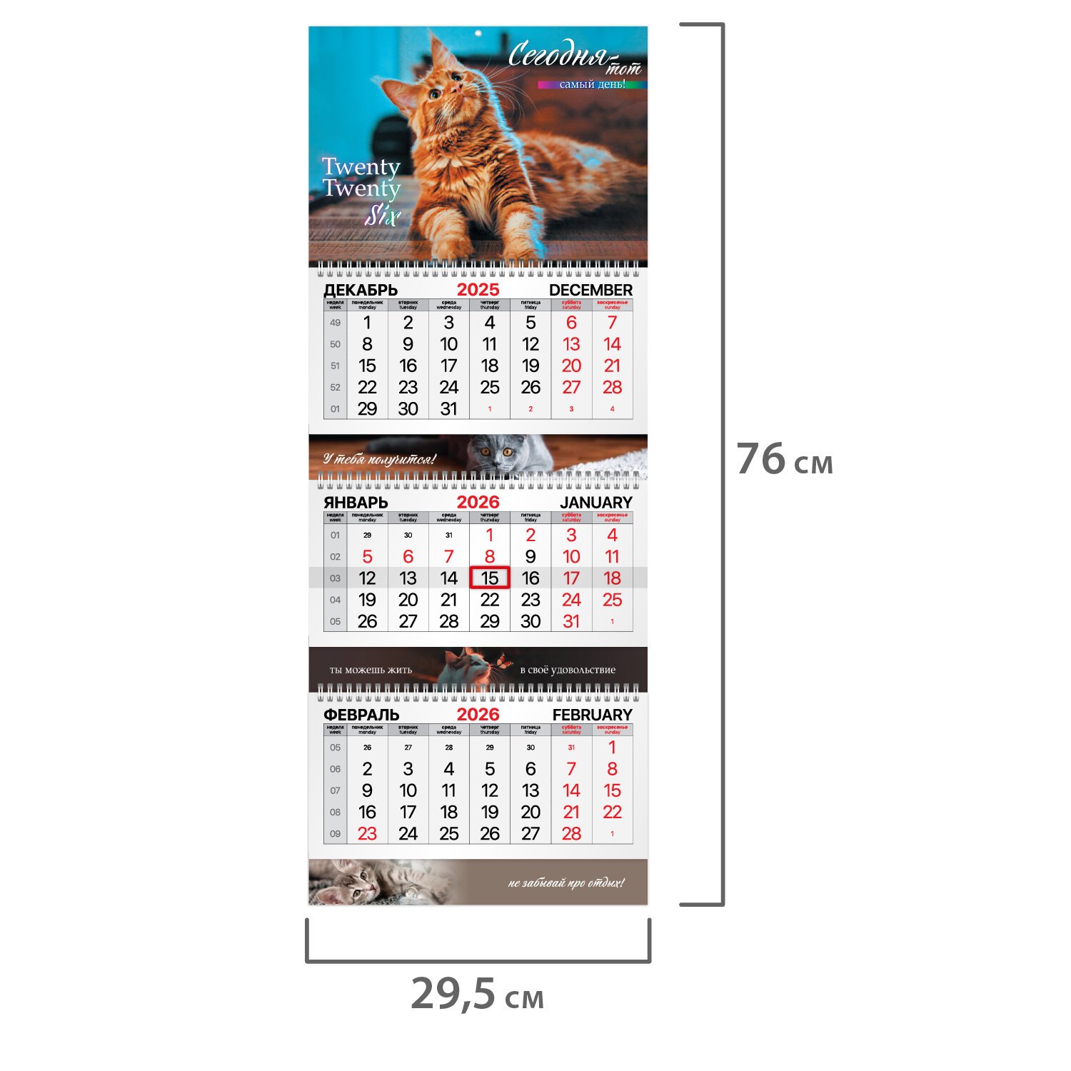 Блок календаря напечатан на мелованной бумаге плотностью 80 г/м2. Подложка изготовлена из мелованного картона плотностью 250 г/м2. Вертикальное расположение. Размер – 29,5х76 см.