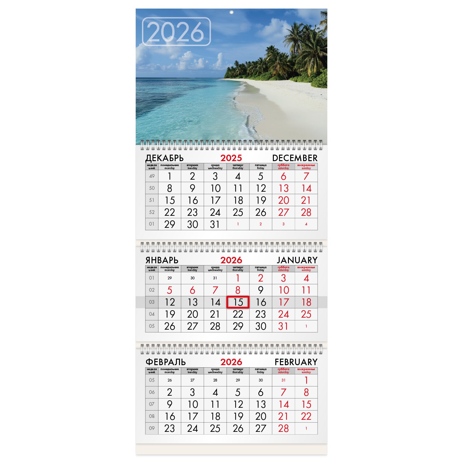Офисный календарь на 2026 год на 3-х гребнях. Для удобства планирования состоит из 3-х блоков с календарными сетками на три месяца – предыдущего, текущего и последующего. Блок календаря напечатан на мелованной бумаге плотностью 80 г/м2. Подложка изготовлена из мелованного картона плотностью 235 г/м2. Курсор-бегунок выделяет текущую дату. Вертикальное расположение.